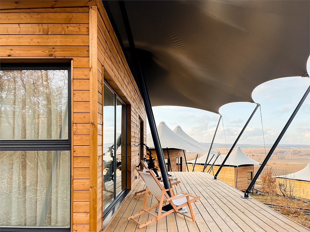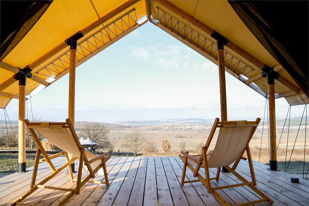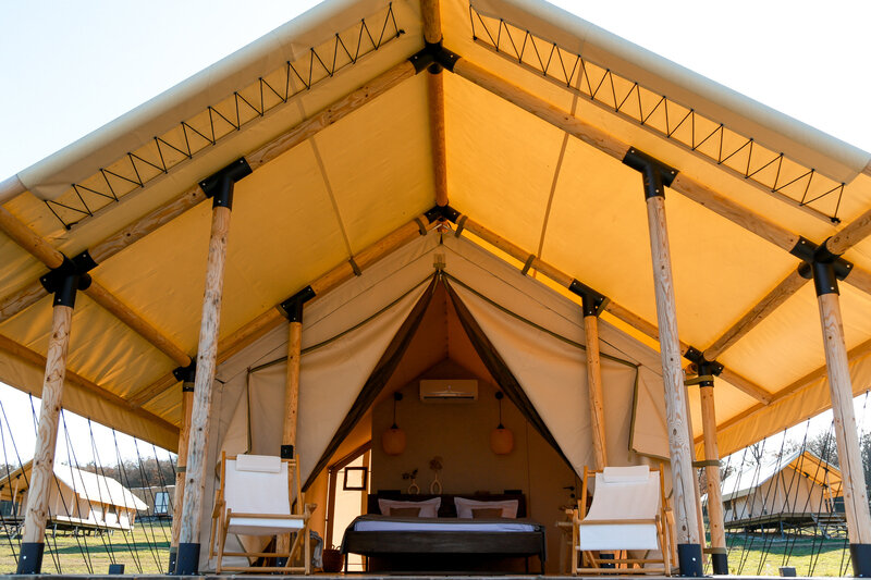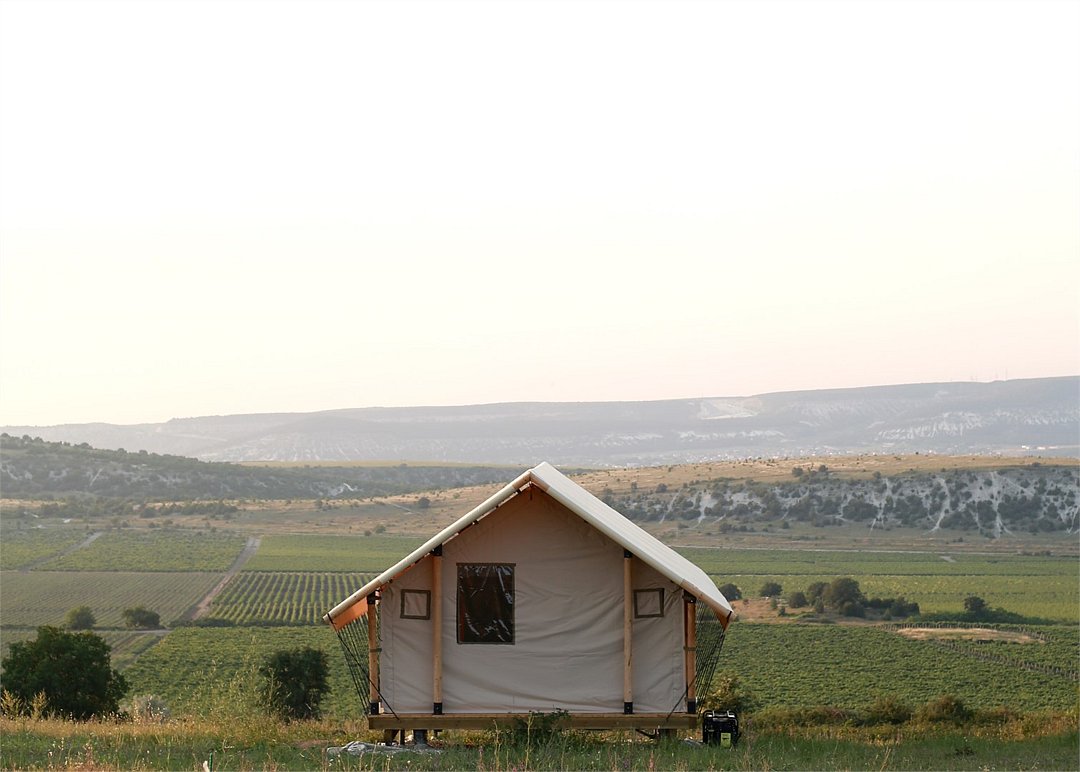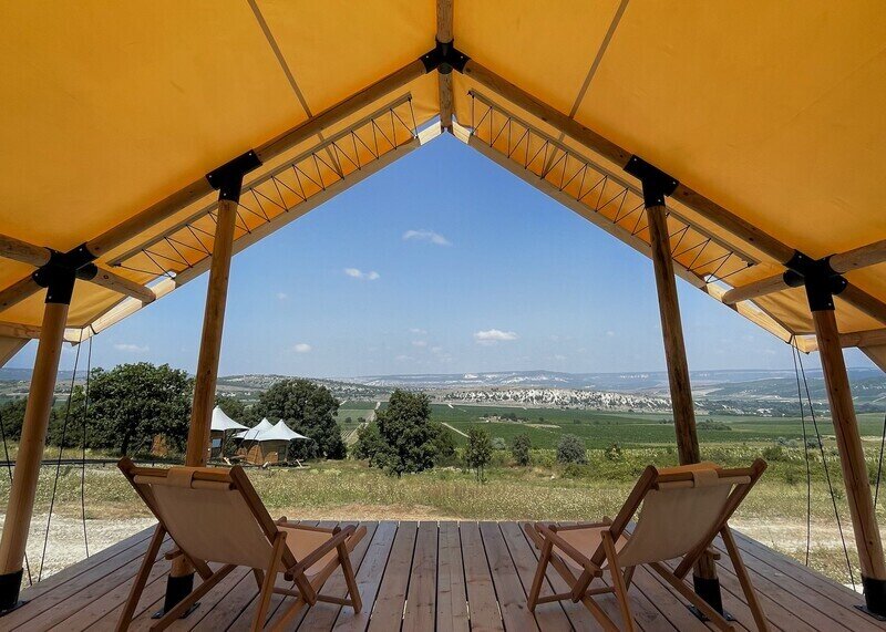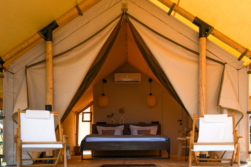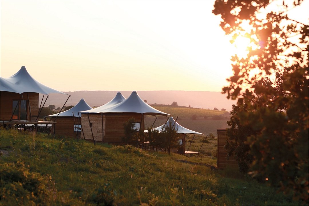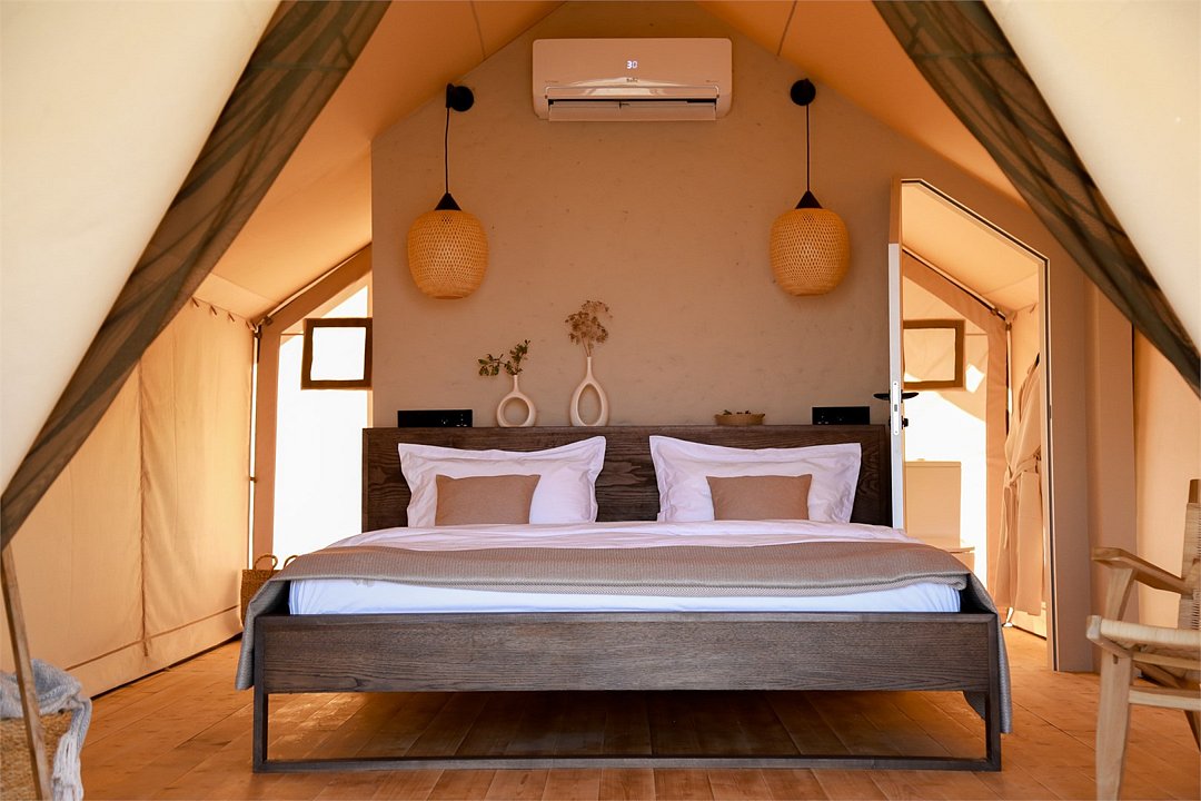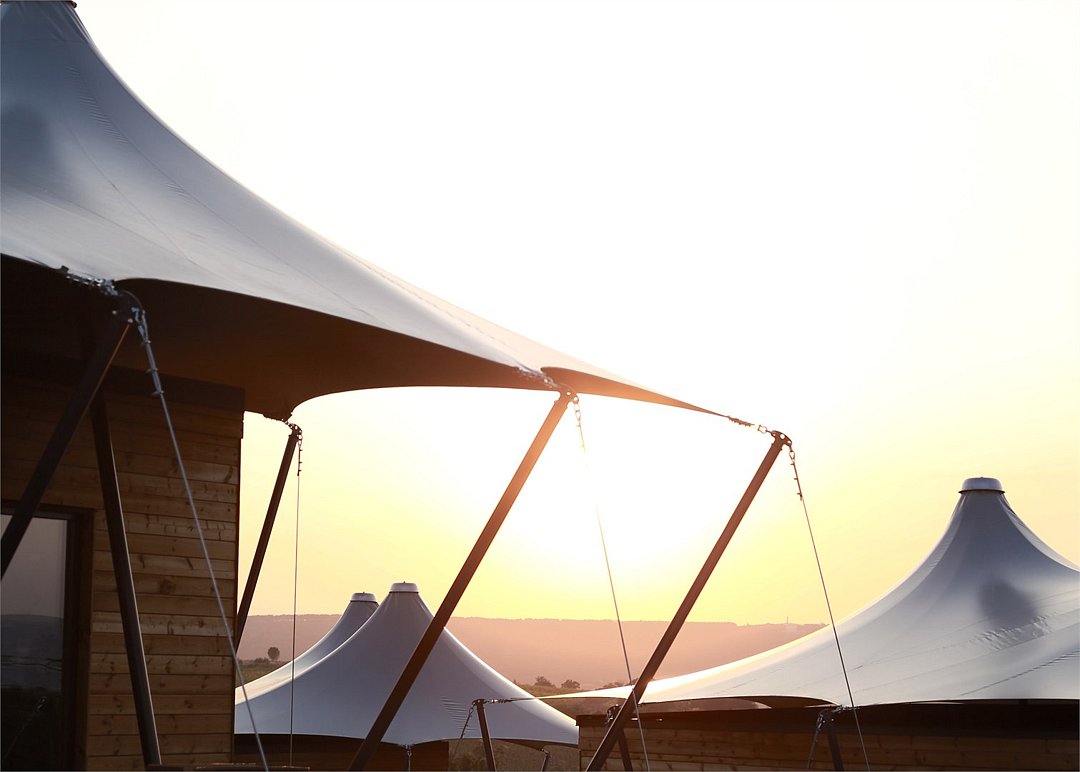 Шатры-тенты сделаны из непродуваемого материала и декорированы дизайнерской деревянной мебелью. В каждом есть большая двуспальная кровать, кондиционер, ванная комната и гардеробная. На террасе с видом на виноградники и холмы — кресла-лежаки, чтобы загорать, читать и любоваться природой.Услуги и удобства