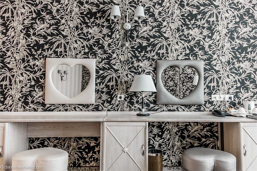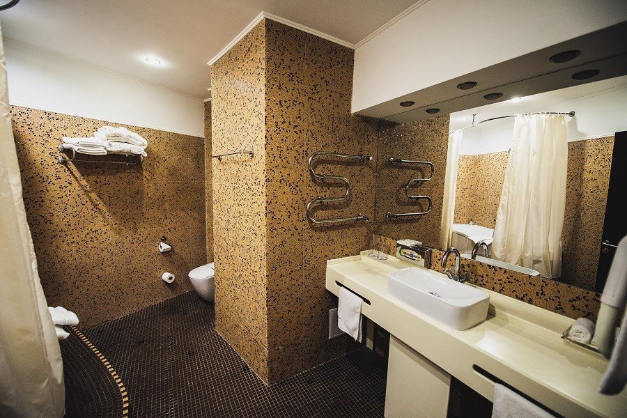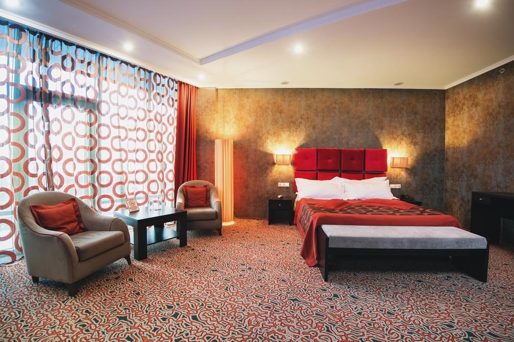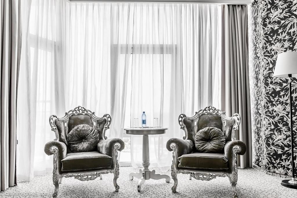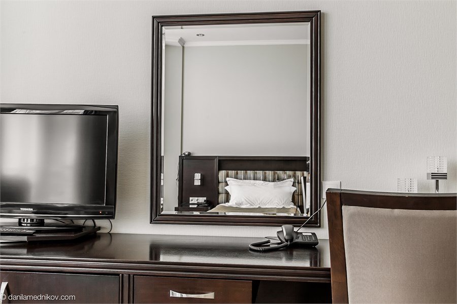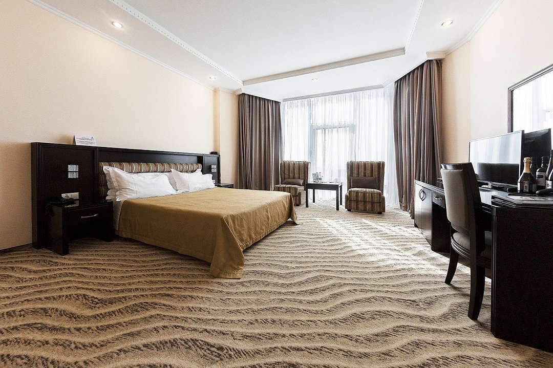 два телевизора, кабельное телевидение, Wi-Fi, интернет, телефон, кондиционер, система климат-контроля, светильник, настольные лампы, фен, будильник, система безопасности, электронные замки, утюг, ванная комната, ванна, санузел, банные принадлежности, халаты, банные полотенца, тапочки, косметические средства, балкон, кровать «King size», гипоаллергенное белье, гладильная доска, детская кровать, диван, кресла, стулья, шкаф для одежды, вешалки, журнальный столик, письменный стол, багажная тумба, зеркало, ковер, две комнаты, мини-бар, письменные принадлежности, чайный набор, набор посуды, обслуживание номеров, информационная карта, меню, минеральная вода, чайник, унитаз, раковина, мягкая мебель, косметическое зеркало, питьевая вода, гостиная зона, ковровое покрытие, отопление, душ, вид на город, кресло, центральное кондиционирование, можно с питомцамиВ гостиничном номере