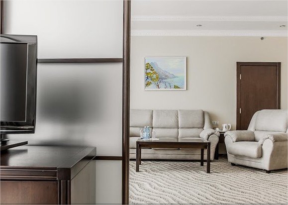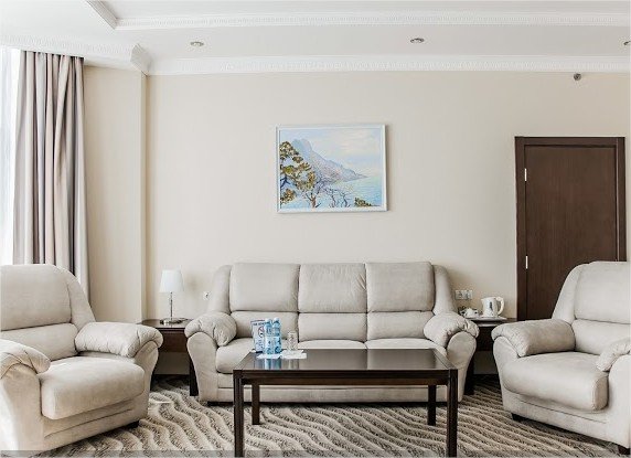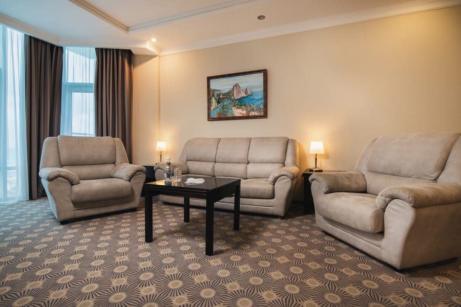 Двухкомнатный номер Люкс подойдет тем, кто ценит комфорт и премиум-отдых. К Вашим услугам просторная гостиная (которая может использоваться в качестве кабинета) и уютная спальня. Номер подойдет для респектабельных деловых людей, а также семей с детьми, ведь здесь есть все необходимое как отдыха, так и для плодотворной работы. Из окон открывается живописный вид на море.Услуги и удобства