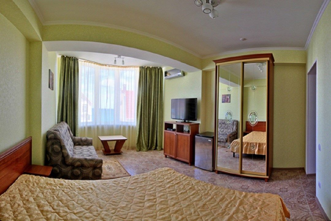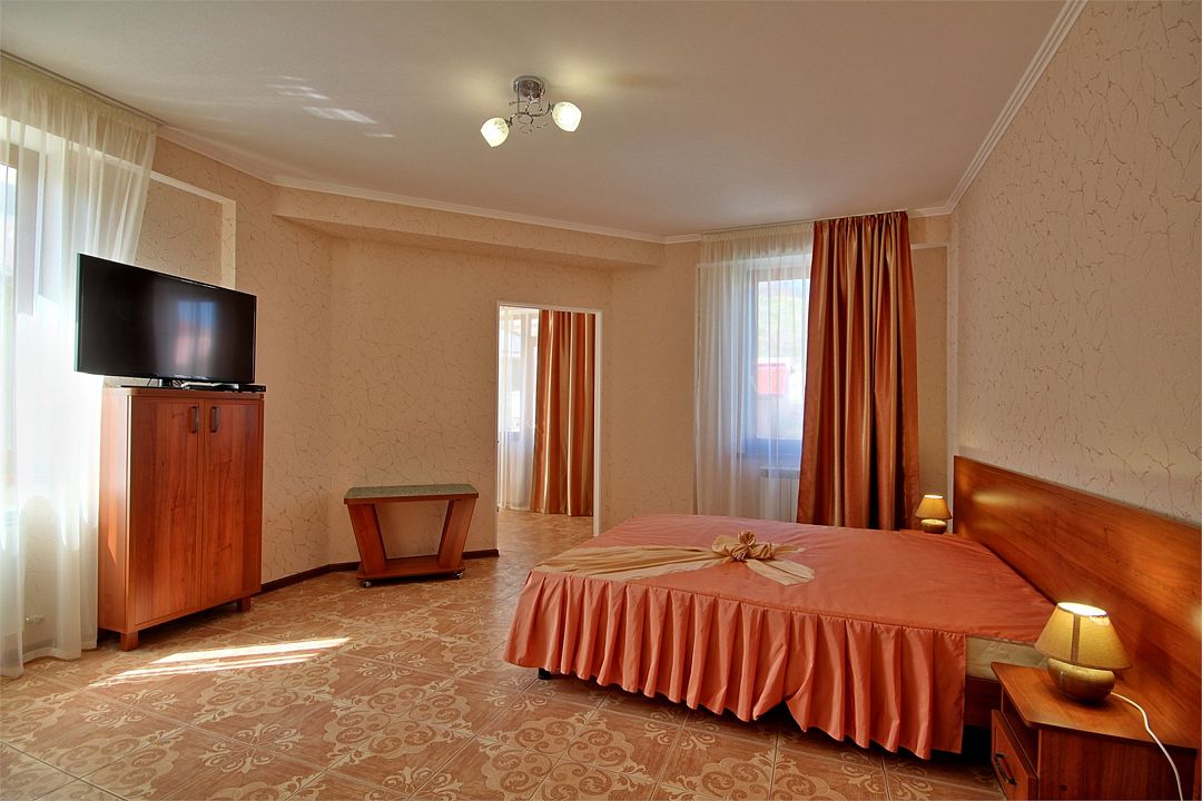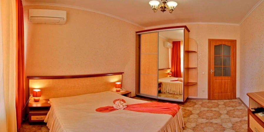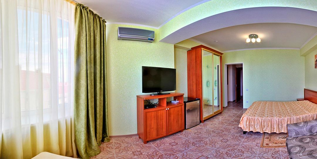 Двухкомнатный номер гостиницы «Вилла «Алина» (Алушта) идеально подойдет для влюблённой пары или отдыха в уединении. Интерьеры номеров (Крым, Алушта, вилла «Алина») выполнены в пастельных тонах, что дарит ощущение нежности, элегантности, романтичности; успокаивает и расслабляет. Во всех номерах гостиницы «Вилла «Алина» — новая удобная красивая мебель, необходимая бытовая техника (плазменный телевизор, холодильник), современное сантехническое оборудование. Чувствуйте себя как дома! Кондиционер дарит бодрящую прохладу. Спутниковое телевидение, Wi-Fi — и вы постоянно в курсе событийУслуги и удобства