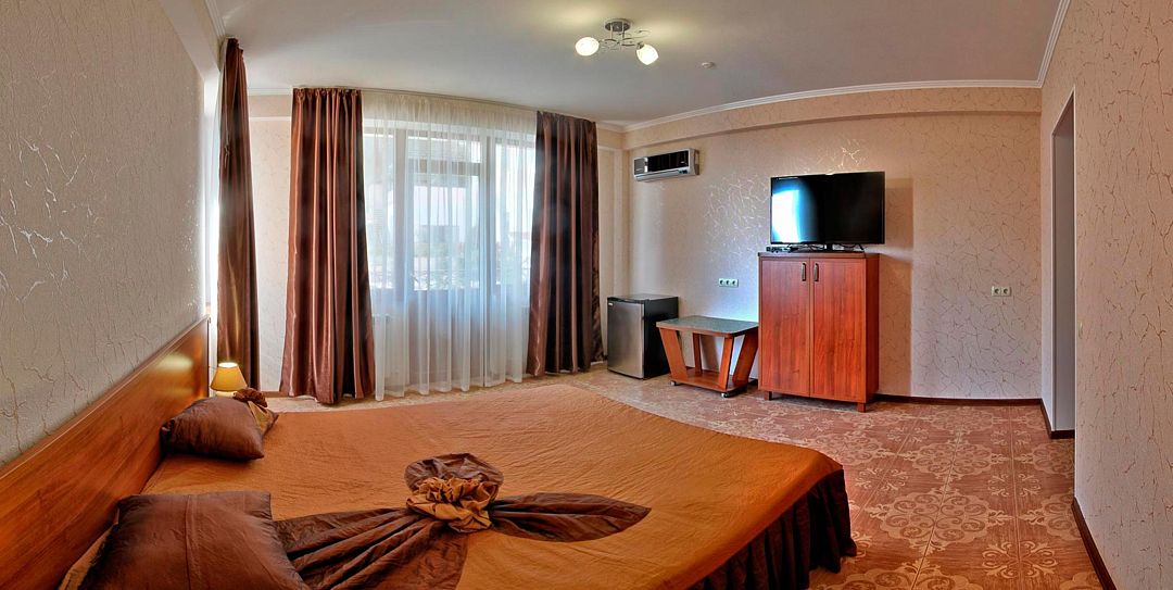 телевизор, спутниковое телевидение, Wi-Fi, холодильник, кондиционер, фен, балкон, двуспальная кровать, шкаф для одежды, две комнаты, набор посуды, сейф, чайник, душ, туалет, сушилка для белья, диван-кровать, можно с питомцамиВ гостиничном номере