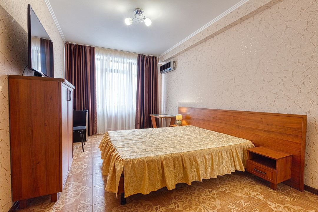 телевизор, спутниковое телевидение, Wi-Fi, холодильник, кондиционер, фен, двуспальная кровать, шкаф для одежды, набор посуды, сейф, чайник, душ, туалет, сушилка для белья, можно с питомцамиВ гостиничном номере