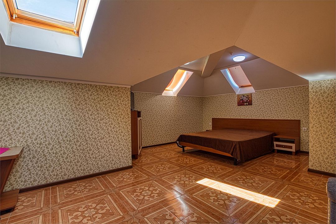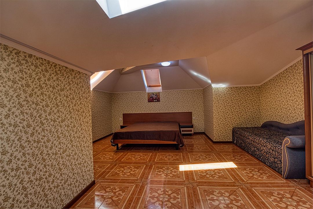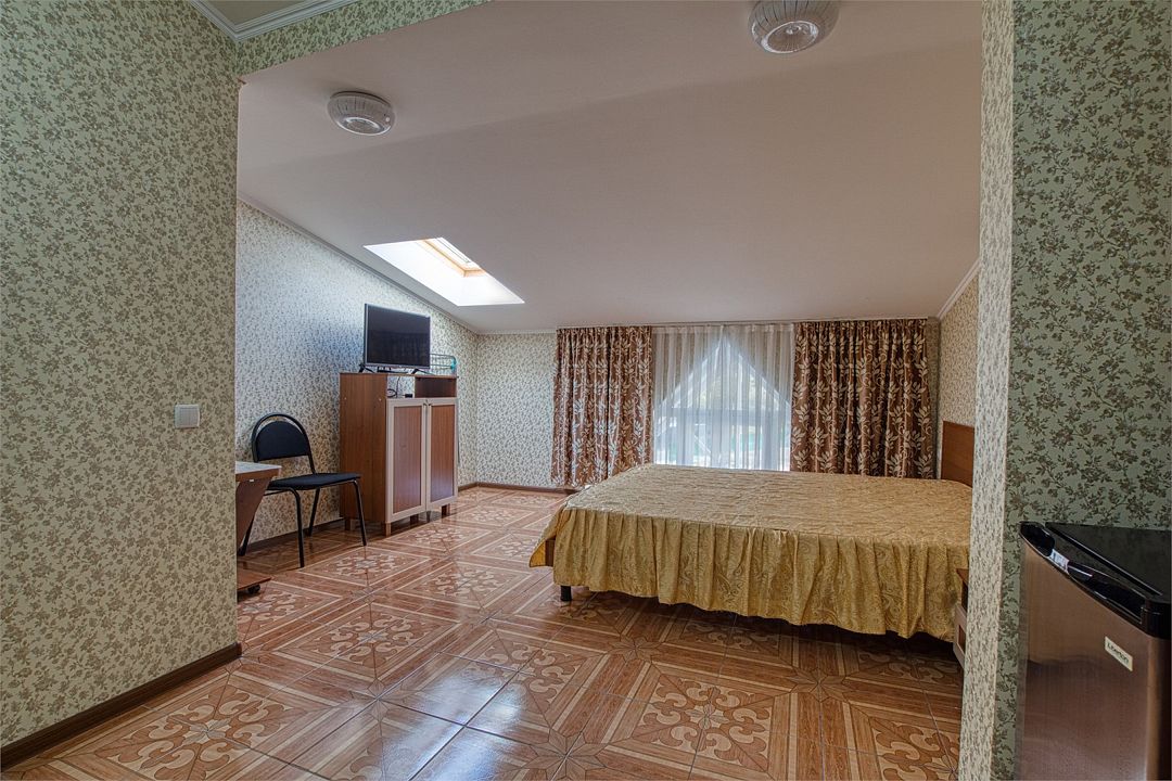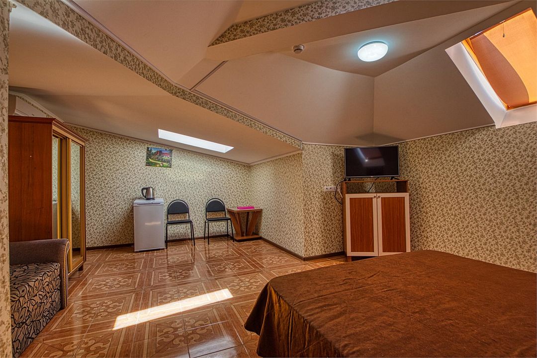 Обратите внимание! в номерах данной категории местами занижены потолки! Мансардный номер гостиницы «Вилла «Алина» (Алушта) идеально подойдет для влюблённой пары или отдыха в уединении. Интерьеры номеров (Крым, Алушта, вилла «Алина») выполнены в пастельных тонах, что дарит ощущение нежности, элегантности, романтичности; успокаивает и расслабляет. Во всех номерах гостиницы «Вилла «Алина» — удобная мебель, плазменный телевизор, холодильник, электрочайник современное сантехническое оборудование. Чувствуйте себя как дома! Кондиционер дарит бодрящую прохладу. Спутниковое телевидение, Wi-Fi — и вы постоянно в курсе событий.Услуги и удобства