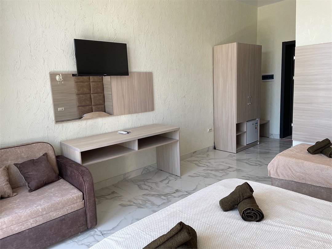 Номер категории "Комфорт" - является номером повышенной комфортности с одной большой двухспальной и односпальной кроватью, балконом и панорамным окном. Идеально подойдет для семейного времяпровождения. Дополнительное место для вашего ребенка в виде кресло-кровати. В номере имеется Шкаф, тумба, телевизор, сплит-система, холодильник, собственный санузел, необходимые полотенца, фен. Гарантирован комфортный отдых на все время прибывания в нашем гостевом доме.Услуги и удобства
