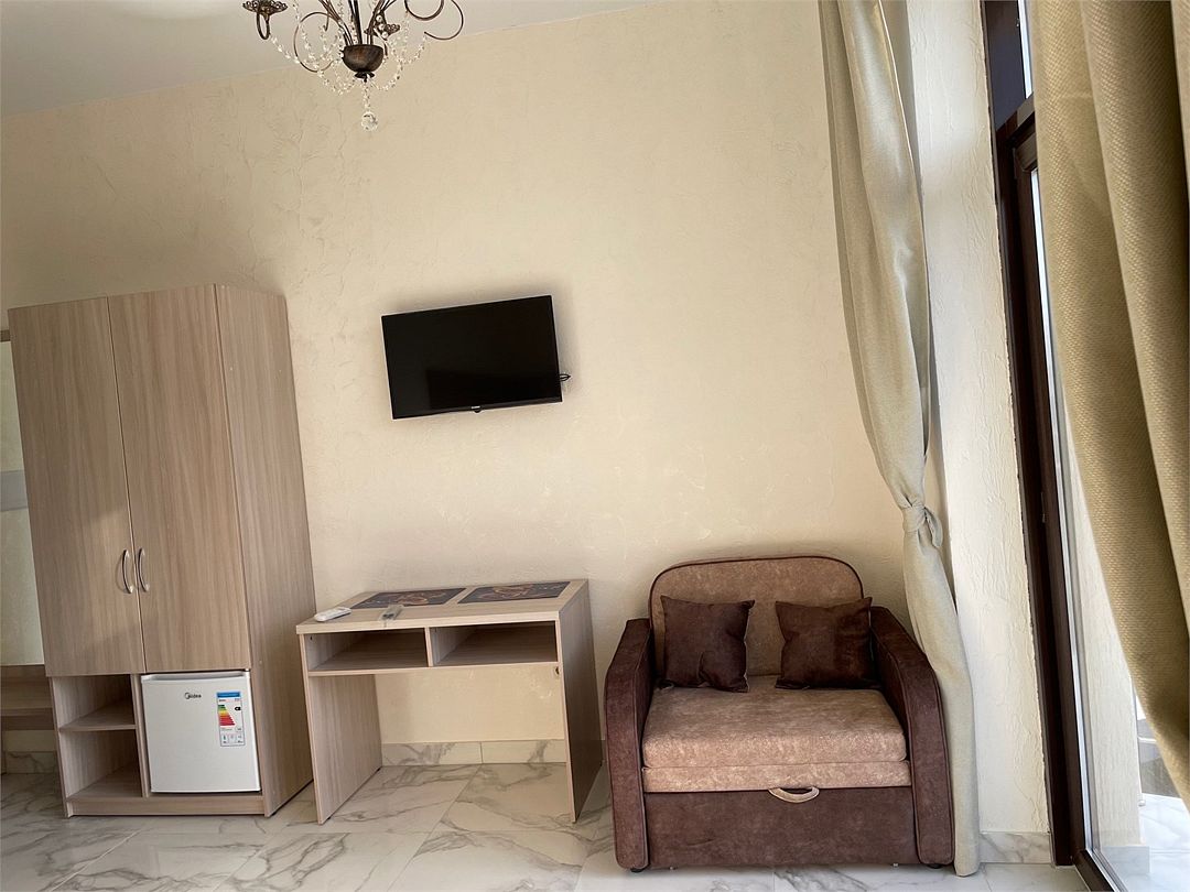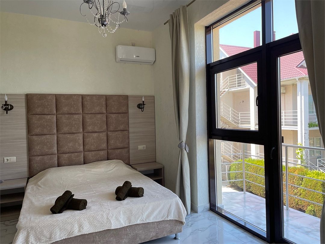 Номер категории "Делюкс" - является номером повышенной комфортности с большой двухспальной кроватью, балконом и панорамным окном. Идеально подойдет для времяпровождения двух человек. Дополнительное место для вашего ребенка в виде кресло-кровати. В номере имеется Шкаф, тумба, телевизор, сплит-система, холодильник, собственный санузел, необходимые полотенца, фен. Гарантирован комфортный отдых на все время прибывания в нашем гостевом доме.Услуги и удобства