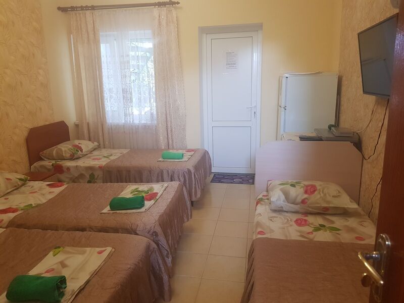 Небольшой двухэтажный гостевой дом, рассчитанный на 60 гостей, разместился на уютной озелененной территории. Гостей ожидают номера Стандарт с кондиционером и без него. Во всех номерах есть собственный санузел с душем, холодильник, телевизор, одно- или двуспальные кровати.