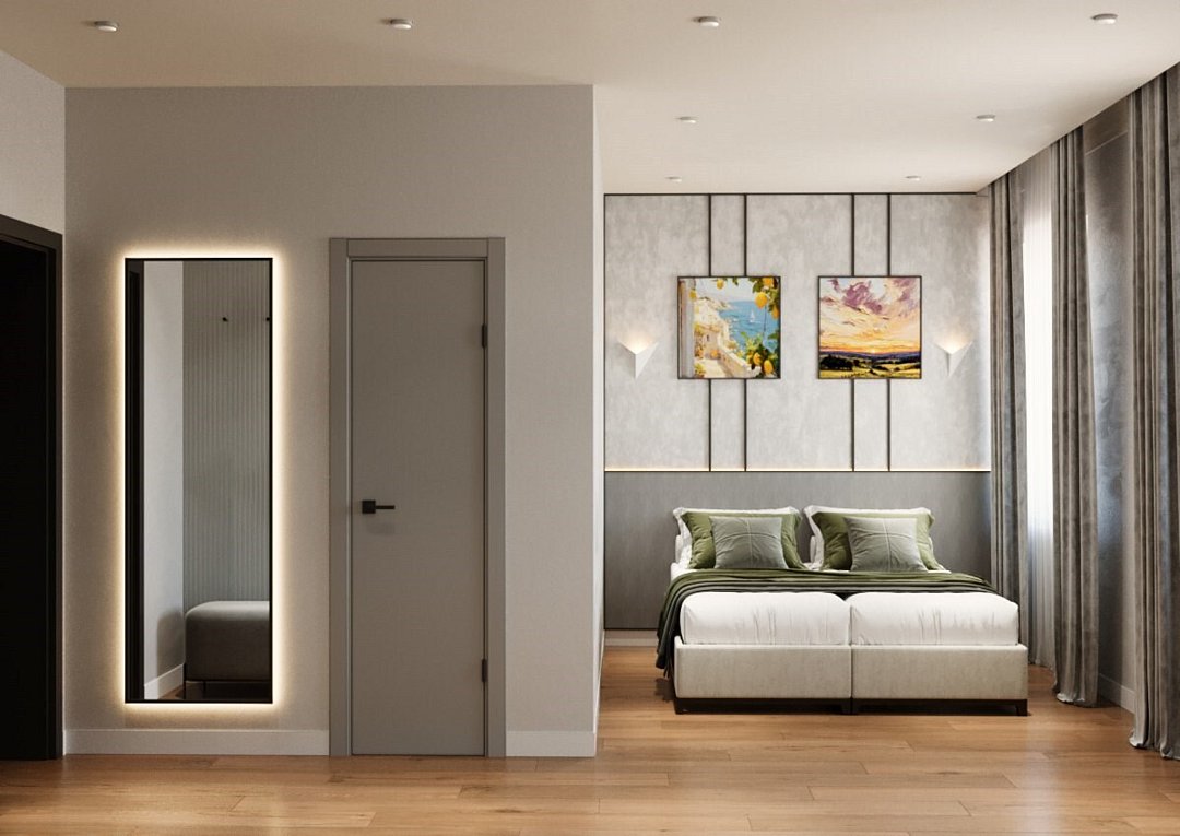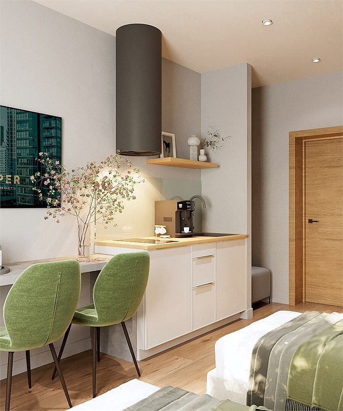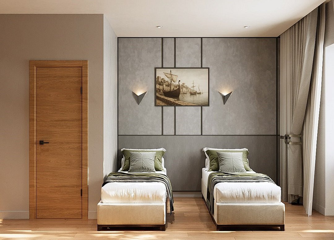 Большой номер с лаконичным дизайном. В номере располагаются 2 односпальные кровати (80*200), которые могут трансформироваться в большую кровать (160*200). Здесь есть все необходимое для комфортного отдыха и плодотворной работы: телевизор с плоским экраном, Wi-Fi, мини-кухня с индукционной плитой, вытяжкой и набором посуды, чайная станция, мини-холодильник, сейф, кондиционер, санузел с душевой, фен, водонагреватель, косметические средства, тапочки, набор полотенец для каждого гостя, махровые халаты, электронные замки, зеркало с подсветкой в полный рост.