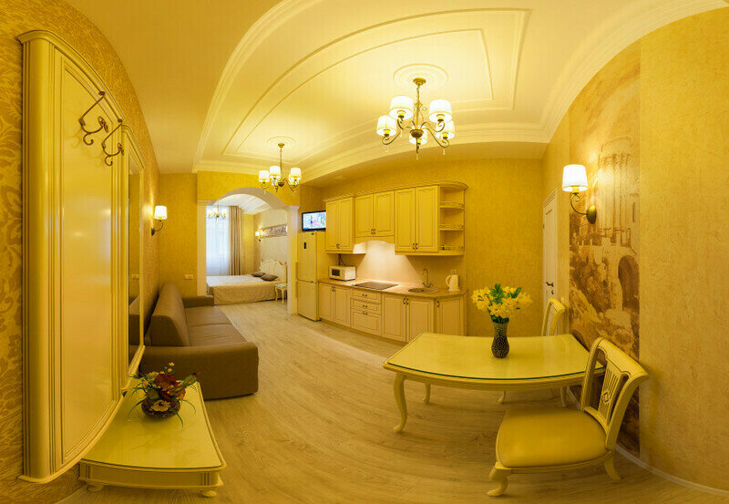 Однокомнатные апартаменты-студия расположены на 1 этаже 3 этажного дома. Выход на террасу с летней мебелью. Вид во двор. В распоряжении гостей двуспальная кровать (180 * 200) и диван, оснащены ортопедическими матрацами; полностью оборудованная кухня с плитой, холодильником, электрочайником, обеденной зоной, кондиционер, телевизор с плоским экраном, сейф, WI-FI. Общая площадь — 40 кв.м. + 9 кв.м. терраса. Максимальное размещение — 3 взрослых + 1 ребенок