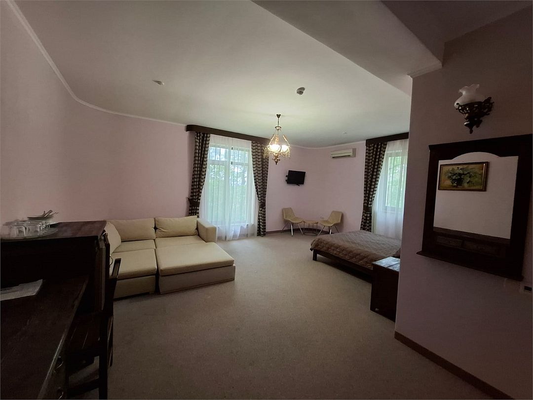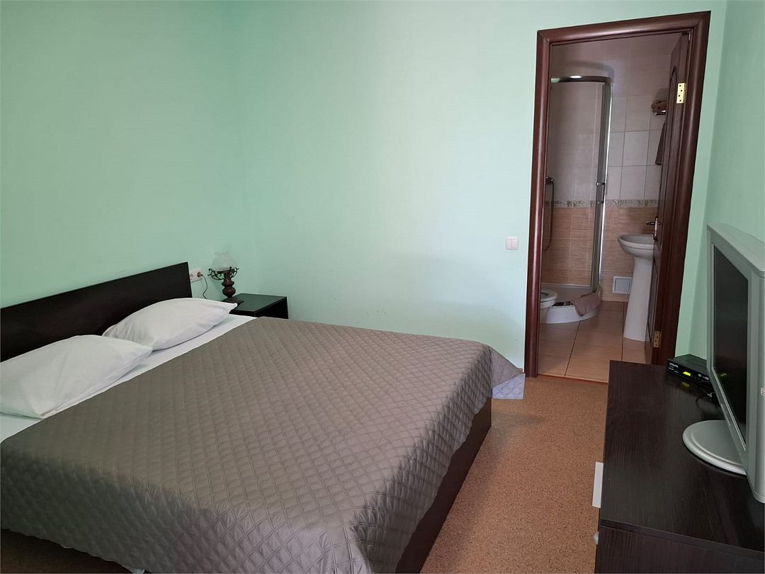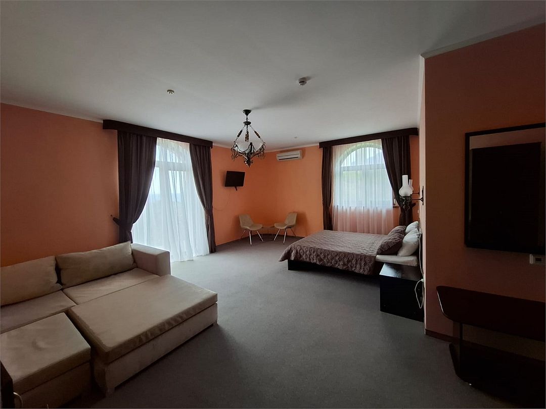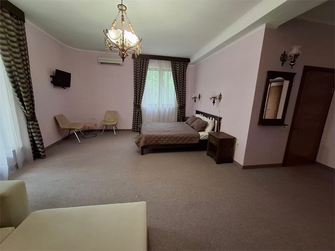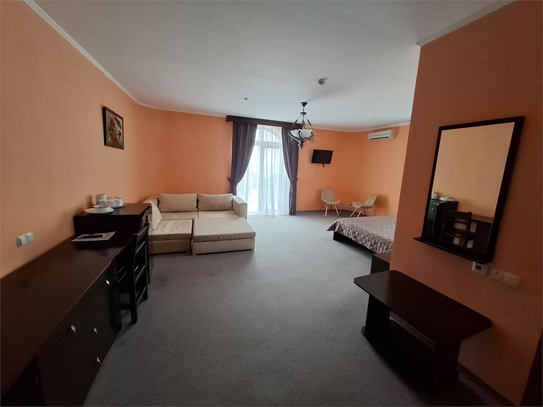 номер с кондиционером, спальня с двуспальной кроватью и гостиная с мягким уголком; со спутниковым ТВ, холодильником, санузлом с горячей и холодной водой круглосуточно (умывальник, туалет, душ).