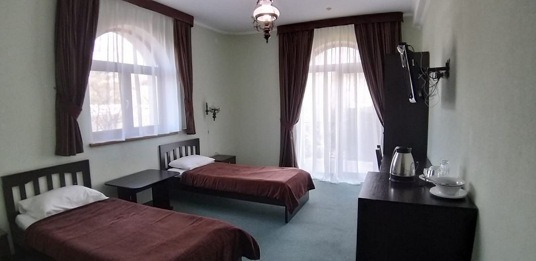 номер с кондиционером, со спутниковым ТВ, холодильником, санузлом с горячей и холодной водой круглосуточно (умывальник, туалет, душ), две раздельные кровати, вместо плательного шкафа настенная вешалка.