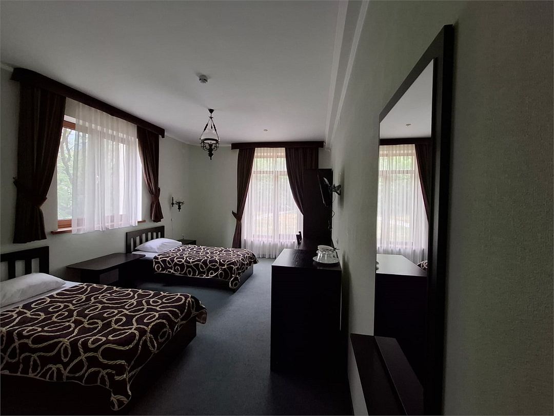 телевизор, Wi-Fi, холодильник, кондиционер, светильник, фен, ванная комната, душевая кабина, банные полотенца, двуспальная кровать, односпальная кровать, шкаф для одежды, вешалки, зеркало, раковина, вид во двор, стаканы, стул, стол, тумба, туалет, вид на парк, вид на горыВ гостиничном номере