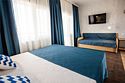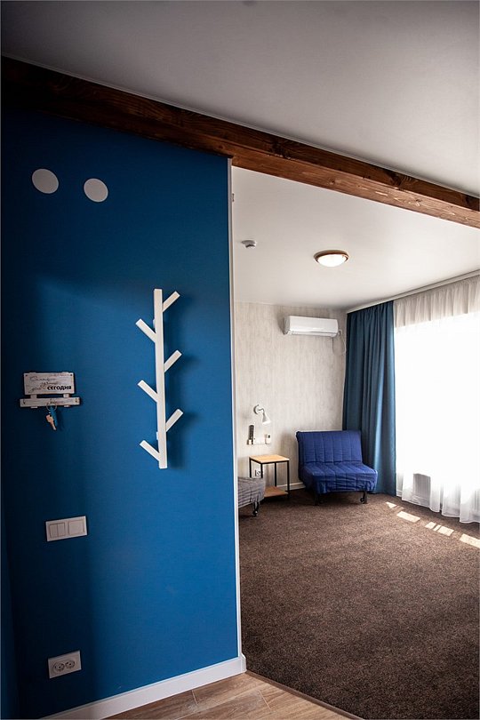 Двухкомнатный номер площадью 26 кв метров с отдельным входом в номер и выходом на балкон. Комнаты разделены раздвигающейся перегородкой. Оборудован двуспальной кроватью / 2 односпальные кровати, односпальным диваном и раскладным креслом / двумя раскладными креслами, плазменным телевизором с функцией Smart TV, wifi, кондиционером, электрическим чайником, холодильником, сейфом и феном, утюгом и гладильной доской. С/у в номере (душевая зона без поддона, умывальник, унитаз, фен) Вид из окон на бассейн и боковой вид на море и Розовое озеро. Номер рассчитан на комфортное размещение 4 человек. 4 основных места. Размещение на доп местах не предусмотрено. Номер расположен на 1-2 этаже.Услуги и удобства