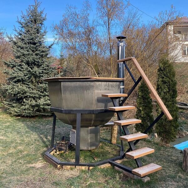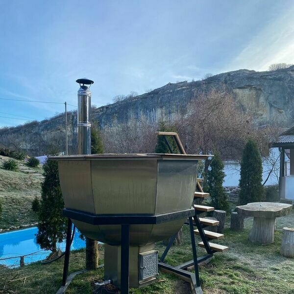 Сауна на 8 персон с купелью, комнатой отдыха, камином и мангальной зоной. Скидка постоянным клиентам — 15%. В аренду включено: чай на травах.