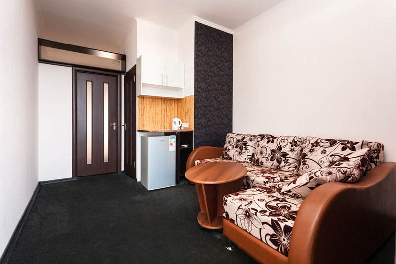 В номере одна большая комната, разделенная на зоны. Есть кухонная зона.