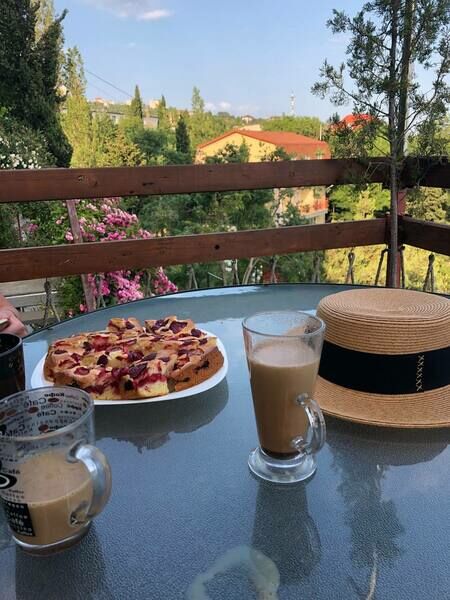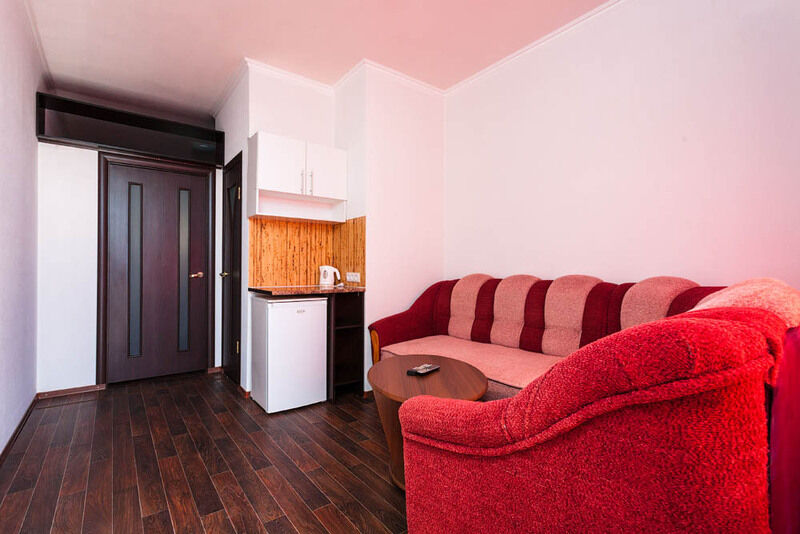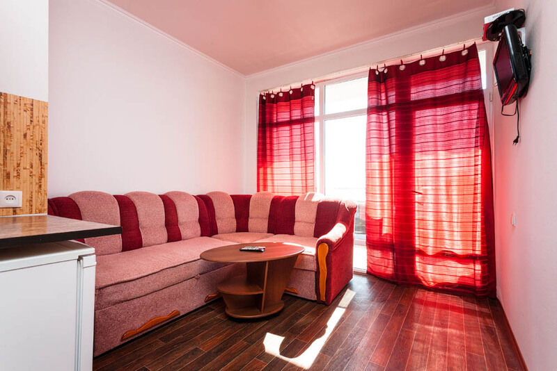 Двухкомнатный номер с кухонной зоной, расположен на третьем этаже. С прекрасным видом на море и горы. На балконе есть дачная мебель.
