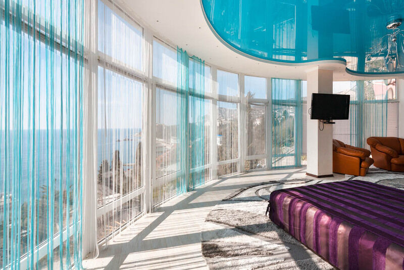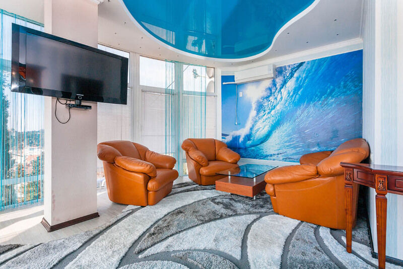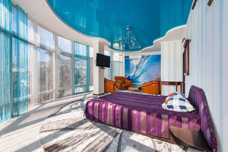 Очень большой однокомнатный номер, разделенный на зоны. Одна стена является панорамным окном с великолепным видом на море и горы. В номере есть джакузи.
