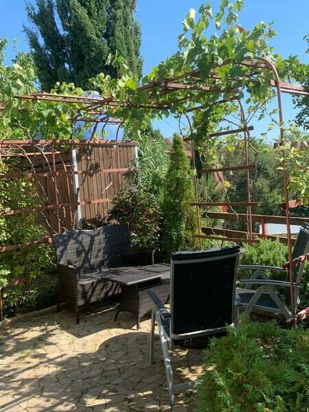Однокомнатный номер с кухонной зоной, расположен на первом этаже. С дачной мебелью на террасе и видом на прекрасный сад.