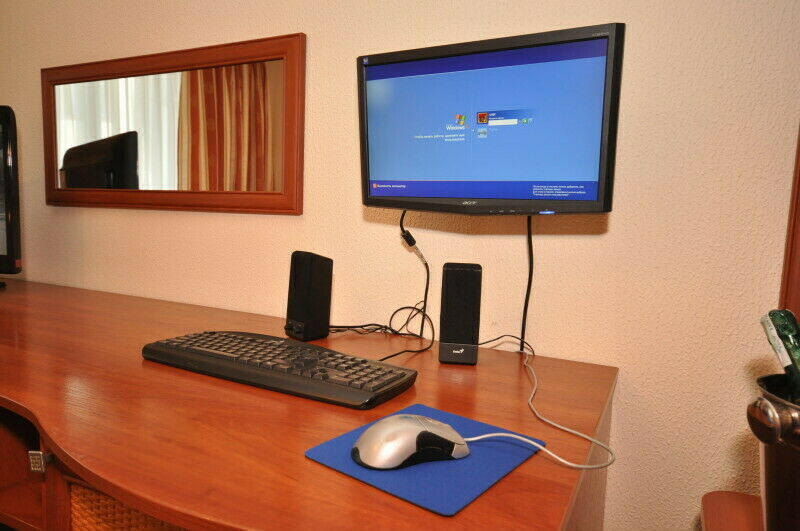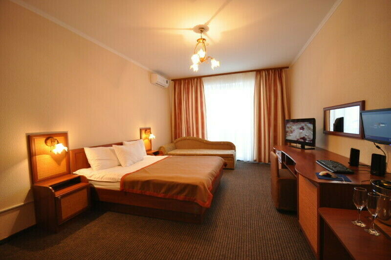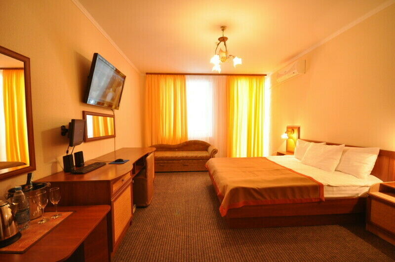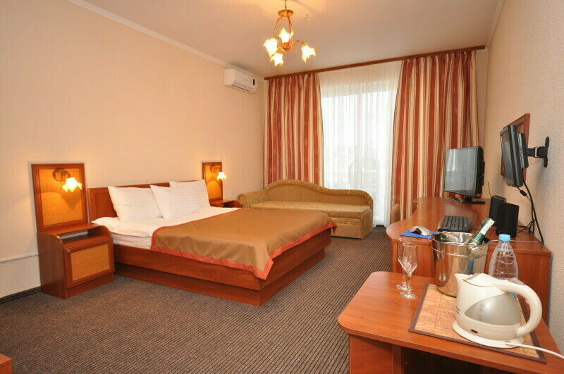 Двухспальная кровать с прикроватными тумбочками и бра, шкаф с вешалкой для одежды, стол, кресло, два настенных зеркала, кондиционер, телевизор, чайник, посуда. Санузел (душ, умывальник, туалет), горячая и холодная вода круглосуточно. В номере - бесплатный WI-FI доступ в Интернет.