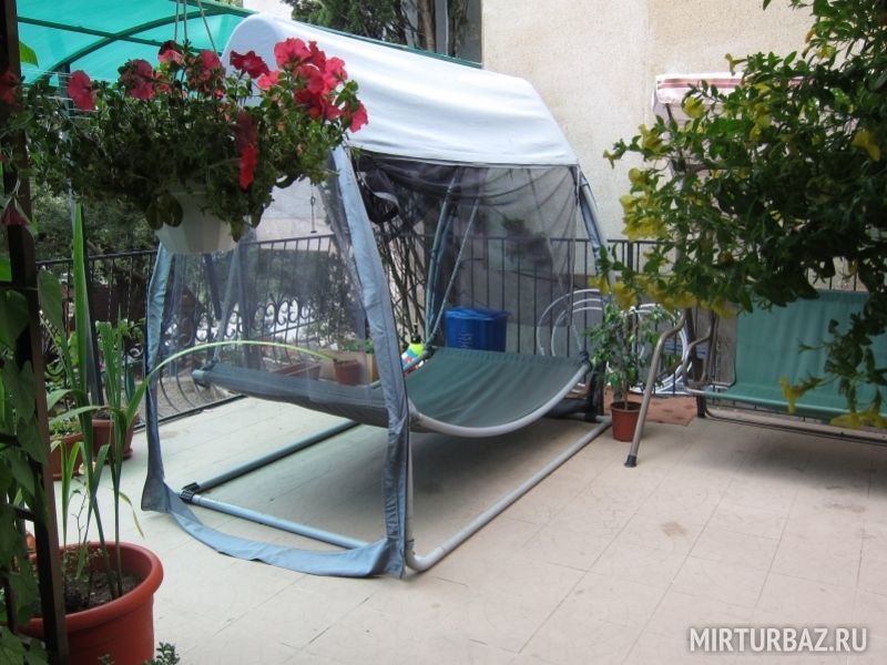 Комната на втором этаже с застекленной верандой. Кондиционер, телевизор, Wi-Fi, стиральная машина. Двуспальная кровать, односпальная кровать, на веранде 1,5-спальный раскладной диван и журнальный столик, 2 табурета, постельные принадлежности, настенная вешалка, шкаф-пенал, тумба. Мини-кухня с электроплитой, вытяжкой, шкафчиками, рабочей поверхностью, раковиной. Холодильник, электрочайник, микроволновая печь. Кастрюли, сковородки, стаканы, кружки, тарелки, ложки, вилки, нож, досточка, открывашка, губка и тряпочка для посуды/стола, моющее средство для посуды. Ванная комната с туалетом, раковина с зеркалом, бойлер, полотенцесушитель, фен, утюг, банные и лицевые полотенца, туалетная бумага, мыло. Площадь комнаты - 19 кв. м. Количество мест - 3. Доп.мест - 1. Вид из комнаты: прекрасный вид во дворик с цветами и беседками, водоемом с рыбками.В номере