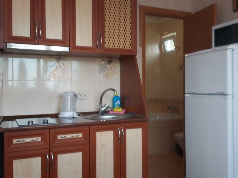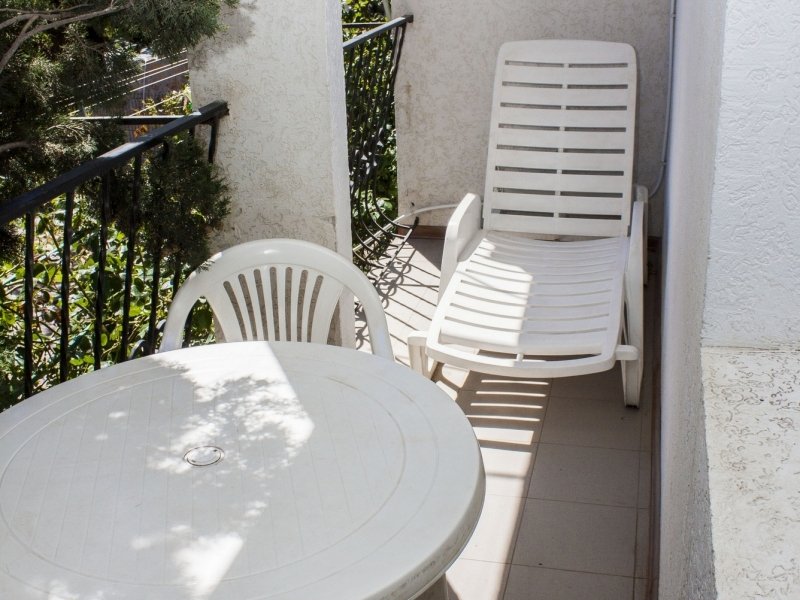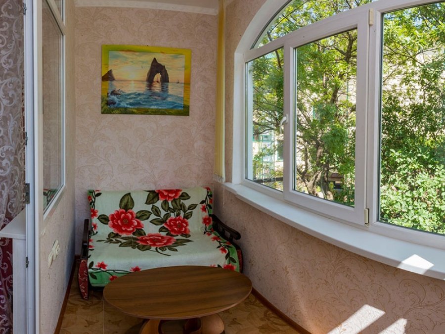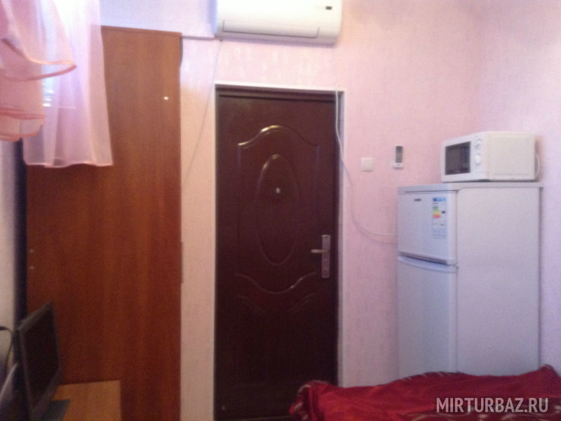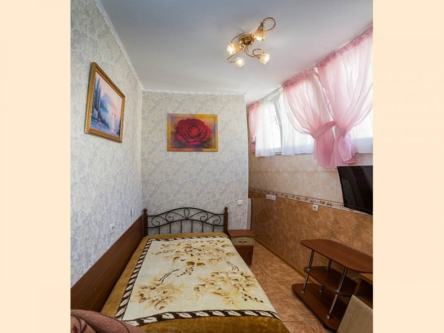Небольшой стандартный номер с балконом. На балконе столик со стулом. Номер для двоих гостей. Возможно доп.место для ребенка. Кондиционер, телевизор, Wi-Fi, стиральная машина автомат. Двуспальная кровать, шкаф, стол, 2 табурета, кресло-кровать, постельные принадлежности, настенная вешалка-прихожая. Мини-кухня с электроплитой, вытяжкой, шкафчиками, рабочей поверхностью, раковиной. Холодильник, электрочайник, микроволновая печь. Кастрюли, сковородки, стаканы, кружки, тарелки, ложки, вилки, нож, досточка, открывашка, губка и тряпочка для посуды/стола, моющее средство для посуды. Душевая кабина, туалет, гарнитур с раковиной и зеркалом, бойлер, полотенцесушитель, фен, утюг, банные и лицевые полотенца, туалетная бумага, мыло.В номере