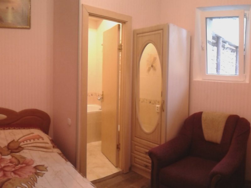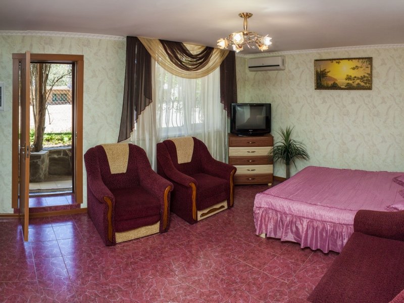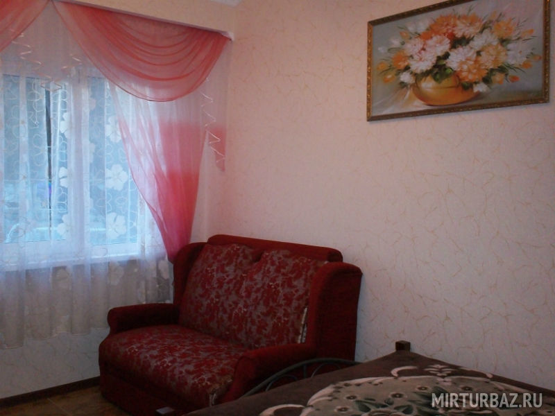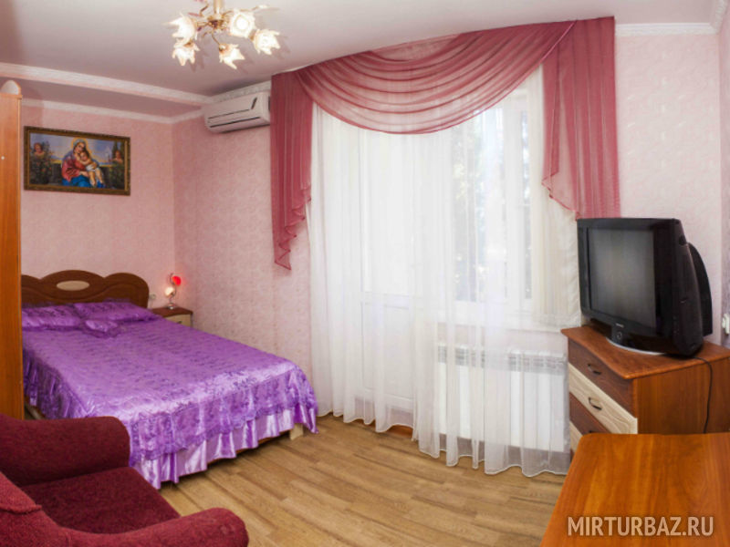 Номер на втором этаже с балконом. На балконе шезлонг, столик и два стула со спинками. 2 комнаты, кухня, 2 кондиционера, 2 телевизора, Wi-Fi, стиральная машина автомат. Основных мест - 4, дополнительных - 1. Площадь номера - 35 кв.м. В большой комнате (с балконом) двуспальная кровать, кресло-кровать, тумбочка, 2 комода, шкаф, стол, 3 табурета, кондиционер, ТВ. В маленькой комнате двуспальный диван, комод, тумбочка, кондиционер, ТВ. Кухня с электроплитой, вытяжкой, шкафчиками, рабочей поверхностью, раковиной. Холодильник, электрочайник, микроволновая печь. Кастрюли, сковородки, стаканы, кружки, тарелки, ложки, вилки, нож, досточка, открывашка, губка и тряпочка для посуды/стола, моющее средство для посуды. Ванная комната с туалетом, гарнитур с раковиной с зеркалом, бойлер, полотенцесушитель, корзина для белья, фен, утюг, все постельные принадлежности, банные и лицевые полотенца, туалетная бумага, мыло.В номере