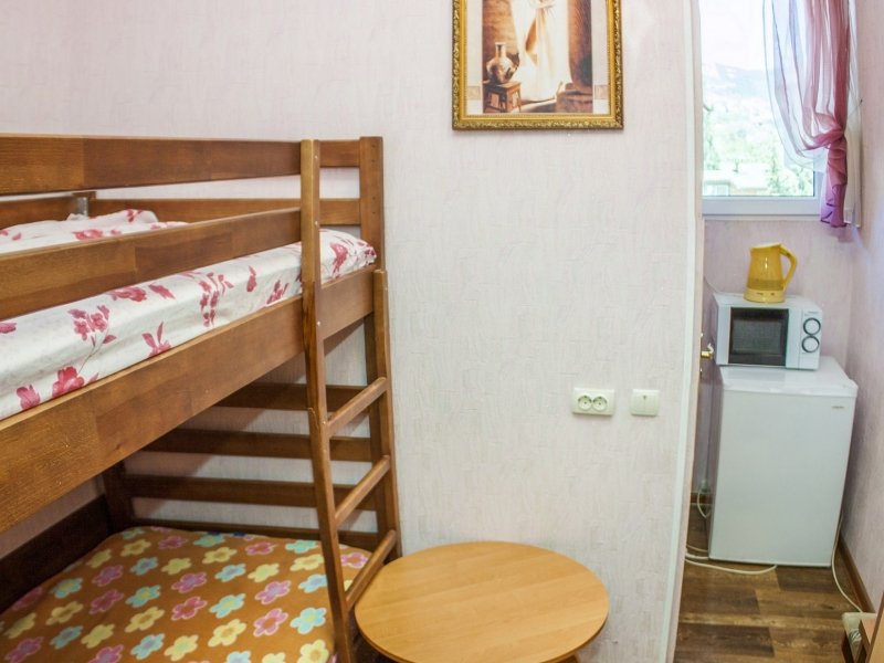 Эконом с двухъярусной кроватью и 1,5-спальным диванчиком Двухъярусная кровать, шкаф, тумбочка, комод, табурет, постельные принадлежности. Кондиционер, телевизор, Wi-Fi, холодильник, электрочайник, микроволновая печь. Стаканы, кружки, тарелки, ложки, вилки, нож, досточка, открывашка, губка и тряпочка для посуды/стола, кастрюля, сковородка. Ванная комната с туалетом, гарнитур с раковиной и зеркалом, бойлер, полотенцесушитель, фен, утюг, банные и лицевые полотенца, туалетная бумага, мыло.В номере