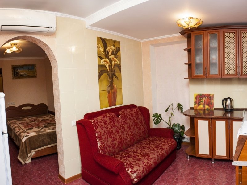 Кондиционер, телевизор, Wi-Fi, стиральная машина автомат. Двуспальная кровать, 1,5-спальный диван и кресло-кровать, постельные принадлежности, комод с зеркалом, 2 тумбочки, стол, ТВ-тумба, шкаф, настенная вешалка-прихожая с тумбочкой для обуви, 4 табурета, стол. Кухня с электроплитой, вытяжкой, шкафчиками, рабочей поверхностью, раковиной. Холодильник, электрочайник, микроволновая печь. Кастрюли, сковородки, стаканы, кружки, тарелки, ложки, вилки, нож, досточка, открывашка, губка и тряпочка для посуды/стола, моющее средство для посуды. Туалет с раковиной, шкафчиком и зеркалом, ванная комната с раковиной и гарнитуром, бойлер, полотенцесушитель, фен, утюг, банные и лицевые полотенца, туалетная бумага, мыло.В номере