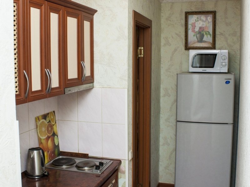 Небольшой бюджетный однокомнатный номер для двоих гостей. Возможно размещение с ребенком (доп. место - раскладное кресло-кровать). В номере также есть телевизор, Wi-Fi, кондиционер, шкаф, комод, постельные принадлежности. Холодильник, электрочайник, микроволновая печь, электроплитка, ложки, вилки, тарелки, стаканы, кружки, открывашка, нож, досточка, губка и тряпочка для посуды/стола, кастрюля, сковорода. Ванная комната с туалетом, банные и лицевые полотенца, бойлер, фен, утюг, туалетная бумага, мыло.В номере