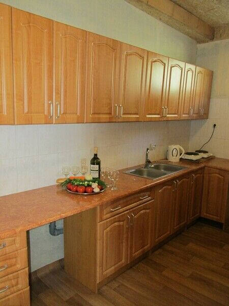 При зале оборудована кухня: СВ-печь, холодильник, газовая плита, набор посуды.