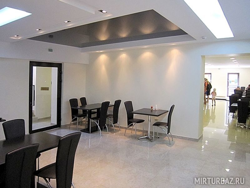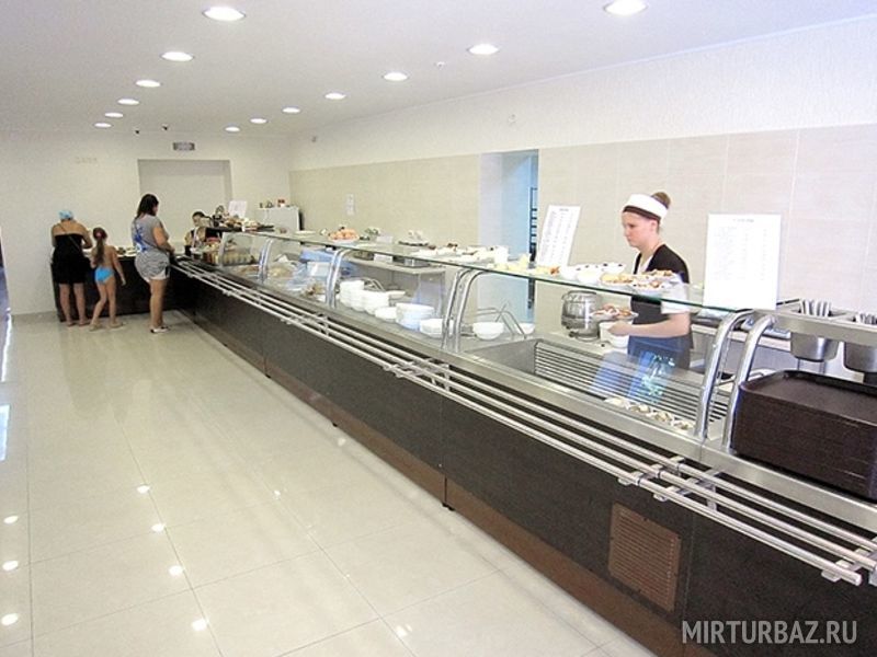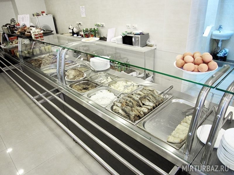 Обширное меню: на завтрак блинчики, омлеты, творожная запеканка, молочные каши и молочные супы, оладьи и многое другое. Сытный обед предлагает красный и зеленый борщи, солянку, окрошку, грибной, рыбный, овощной и куриный супы, вторые блюда из рыбы, птицы и мяса, блюда на гриле, а также тушеные овощи и множество гарниров. Полдник порадует сырниками, свежеиспеченными пончиками с джемом и другой выпечкой собственного производства. Ужин продолжается до девяти вечера, поэтому Вы всегда успеет поесть даже после вечерних прогулок и экскурсий