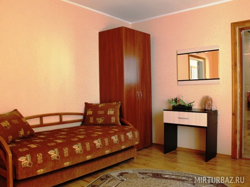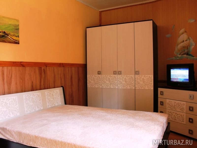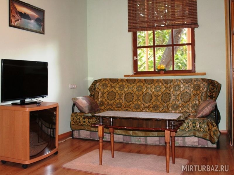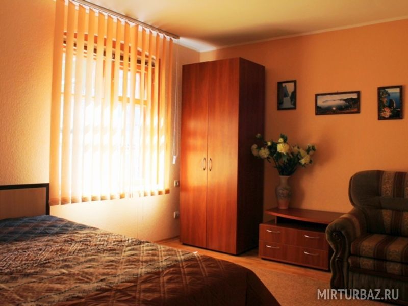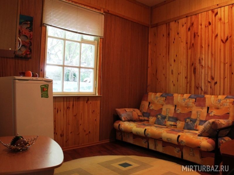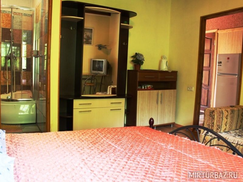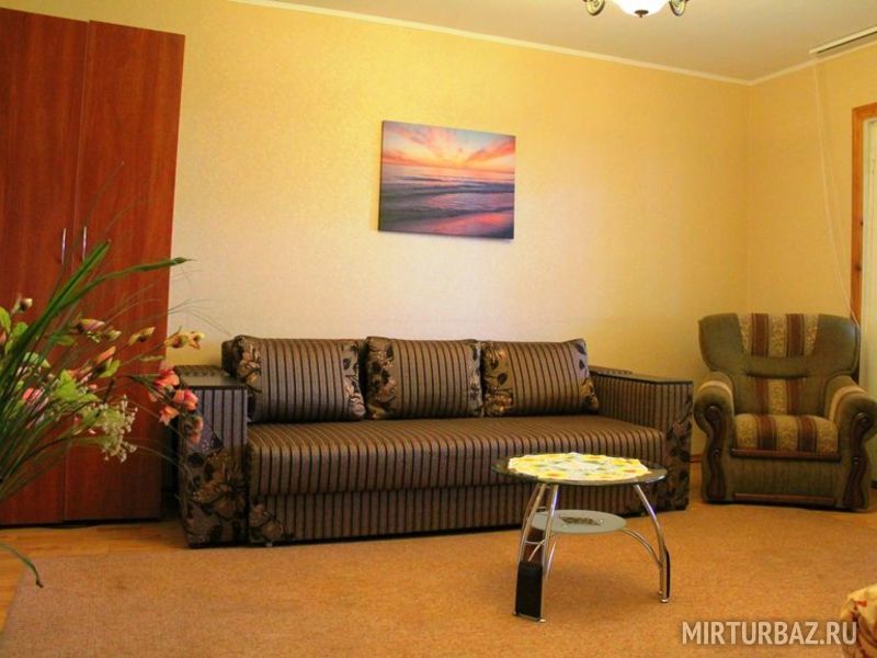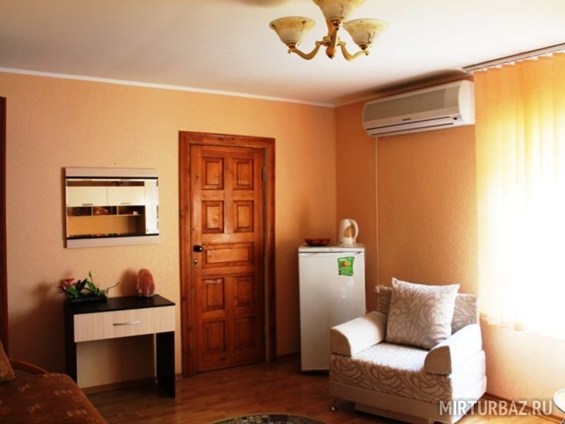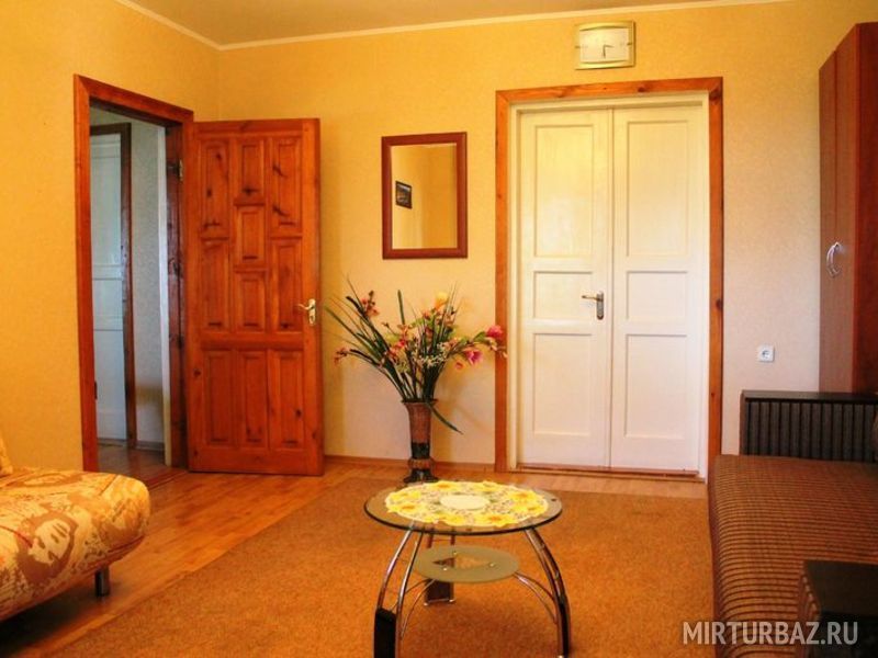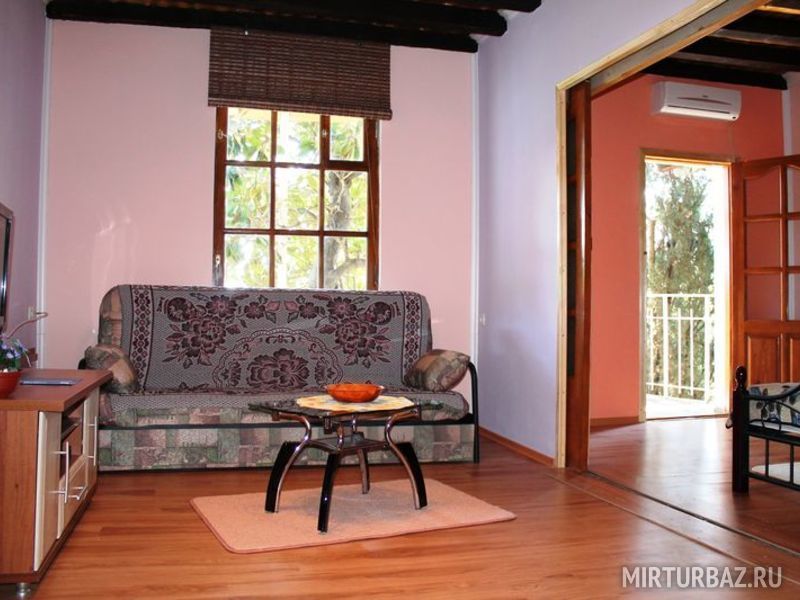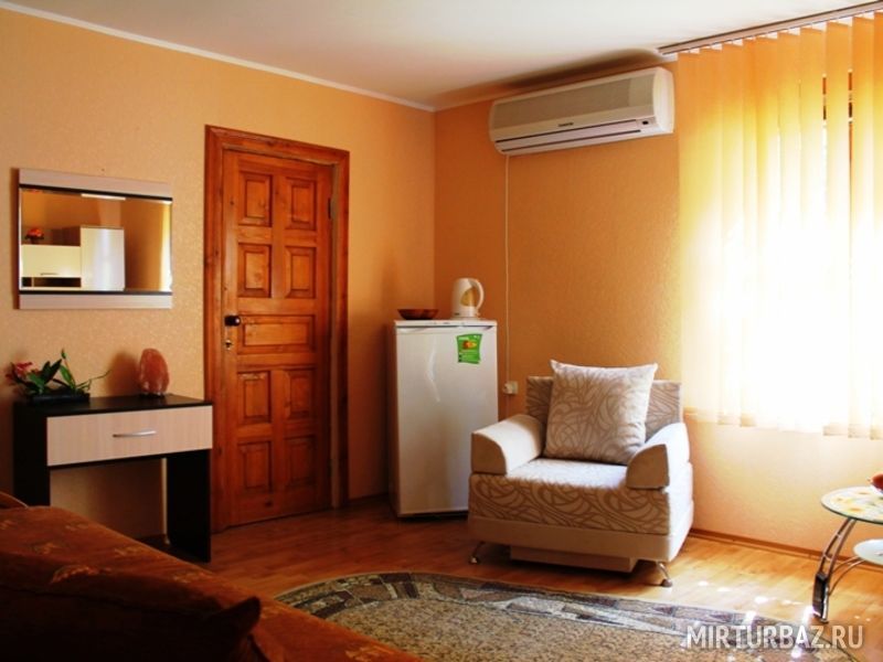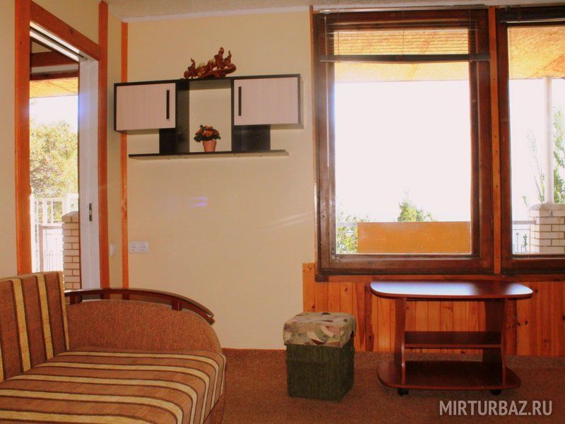 Просторный двухкомнатный номер, рассчитанный на 4 человека или менее. Комнаты смежные. Номер обустроен по-домашнему и с комфортом: ортопедические раскладные диваны и кресла, тумбочки, вместительный шкаф для одежды, телевизор, холодильник, чайник, доступ к Интернету, стол и стулья. Есть свой отдельный балкон с видом на море. Прямо на стол свисают ветви, увешанные гроздьями сладкого Крымского винограда…Санузел смежный, состоит из душевой кабины, умывальника, унитаза.