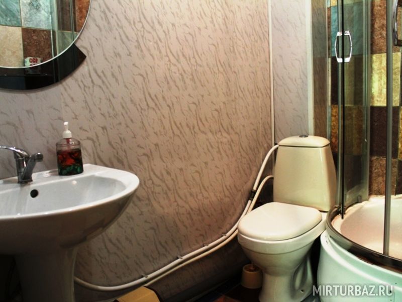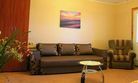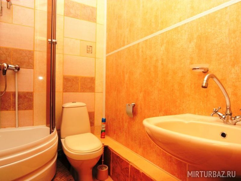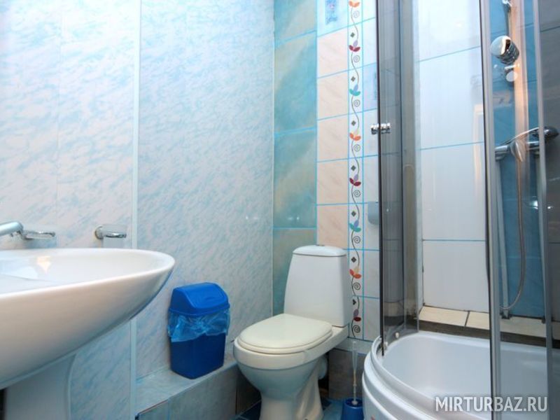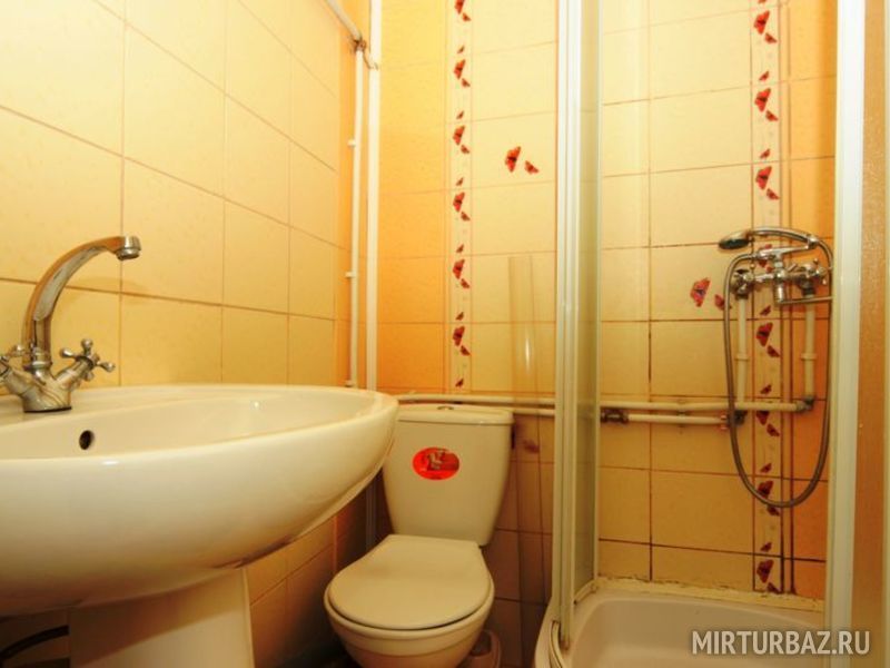 Номер 2х-комнатный, рассчитан на 4х человек. В номере есть большая двуспальная кровать и двуспальный диван, тумбочки, вместительные шкафы для одежды, кондиционер, телевизор, холодильник, чайник, набор посуды, доступ к Интернету, стол и стулья. Санузел смежный, состоит из душевой кабины, умывальника, унитаза.