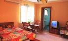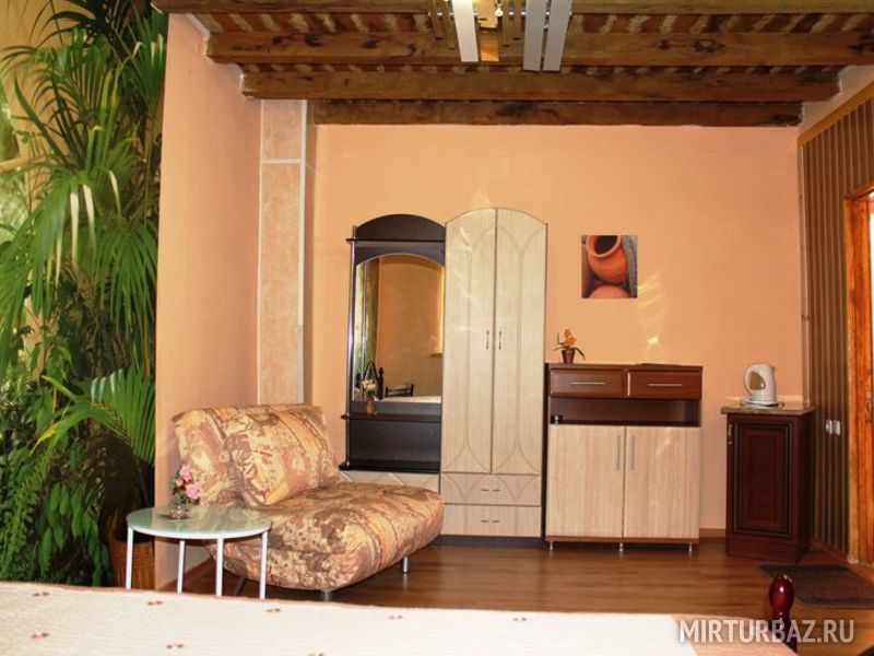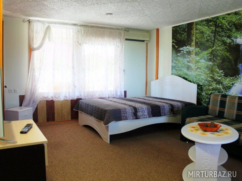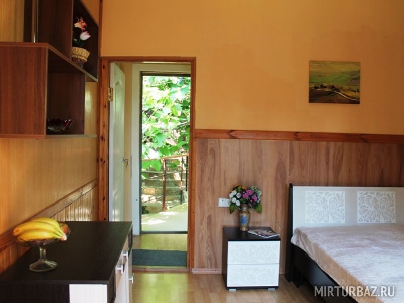 Просторный однокомнатный двухместный номер. Основное спальное место может быть как двуспальным, так и двумя односпальными. Номер оснащён всем необходимым для комфортного отдыха: кондиционер, телевизор, холодильник, чайник, набор посуды, доступ к интернету. К номеру прилегает большой балкон, обвитый виноградом, и с видом на море.