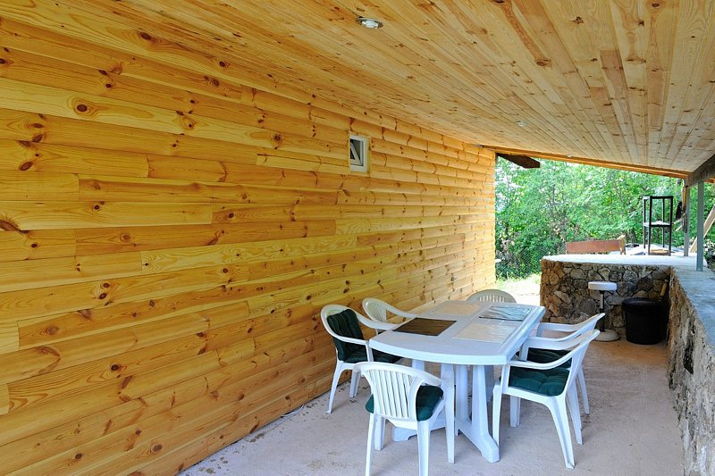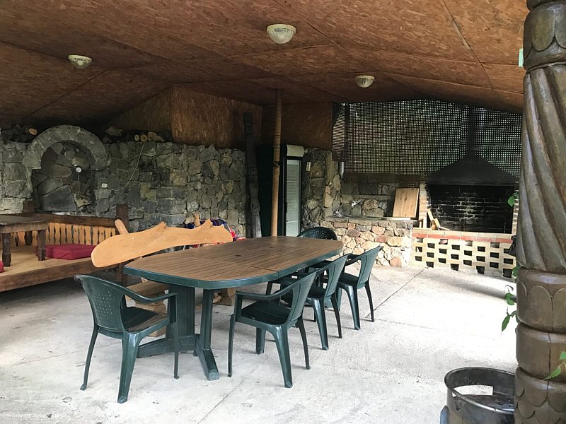 На улице под навесом организовано место для отдыха с мангалом и большим столом.