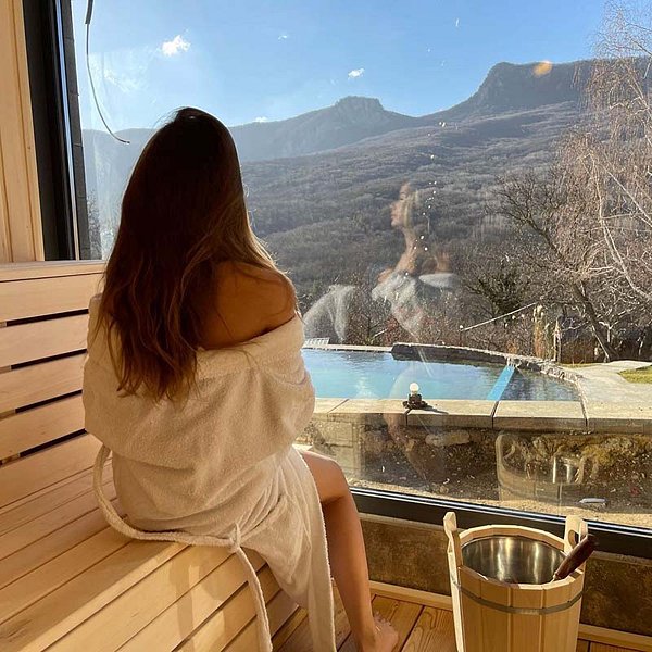 Русская баня на дровах, банный чан, бассейн с горной водой. Уникальная видовая парилка с термостеклом позволит вам любоваться незабываемыми крымскими пейзажами. Также вы можете воспользоваться уютным гостевым залом, который вмещает до 8 человек.