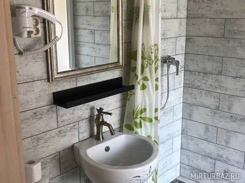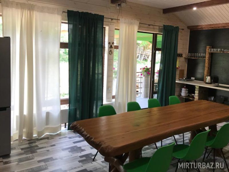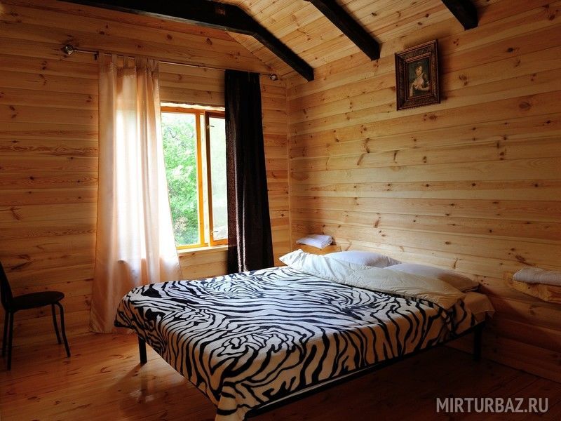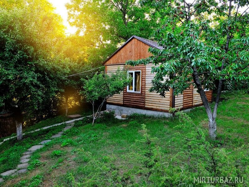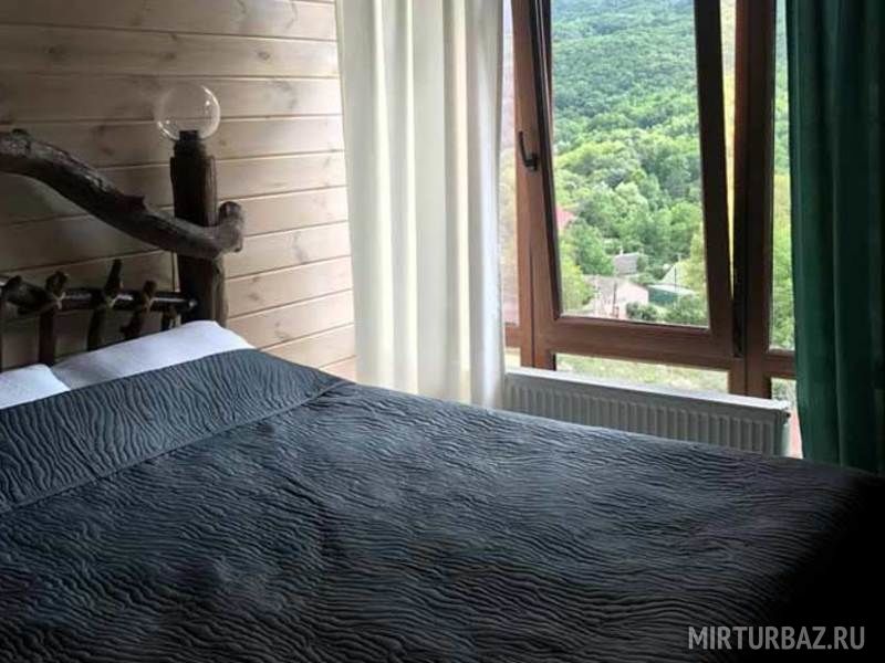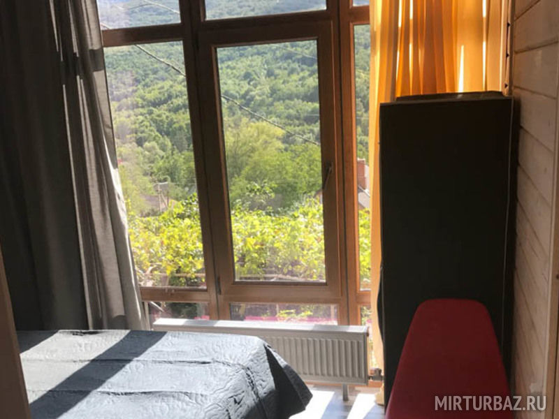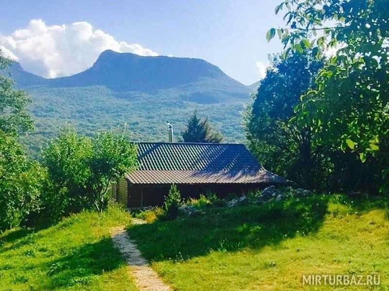 Для большой компании (до 8 человек + 2 дополнительных места) подойдет коттедж в горах Крыма. Он состоит из просторного холла с местом для отдыха и кухней, а также четырех отдельных номеров. В каждом номере есть санузел с горячей и холодной водой, кондиционер, телевизор, бесплатный Wi-Fi.