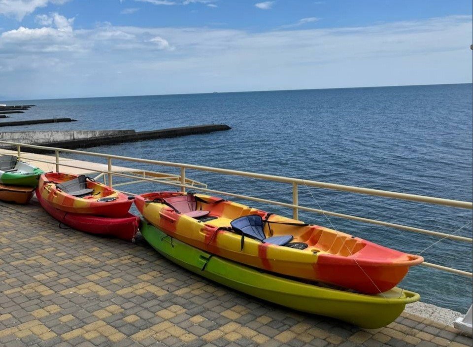 У пансионата 4 собственных больших оборудованных пляжа. На мелко-галечном побережье есть все, что нужно для отдыха у воды – кафе, шезлонги, зонтики от солнца, раздевалки.