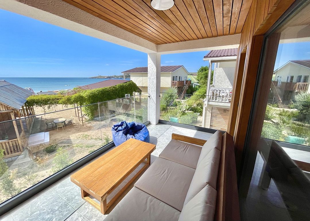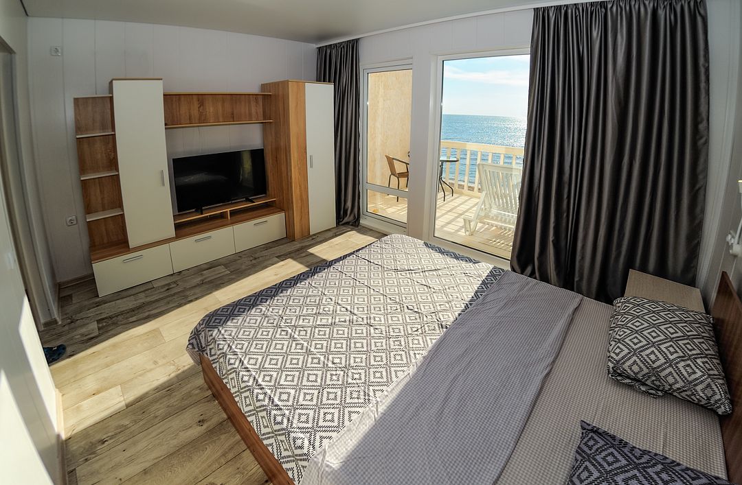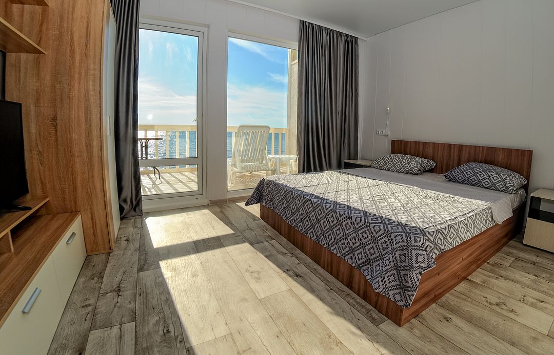 Уютный и просторный 3-х комнатный люкс с видом на море, идеальное решение для большой семьи . В номере комфортно могут разместиться 6 человек . Так же предоставляется зона барбекю ( мангал, решетка). В стоимость номера входит : уборка номера раз в 3 дня, шезлонги , пляжные мешки, теневые навесы , зона барбекю.
