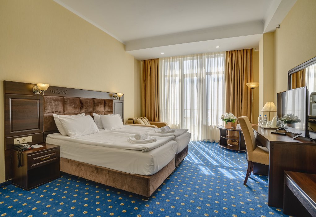 Путешествие с семьейМои 10 дней в отеле БристольНачну с заселения. Оно оказалось в 15, а не в 14 и ни минутой ранее. Т.к. мы приехали к 12, то пришлось оставить чемоданы в отельной камере хранения и погулять. Номер мы заказывали в историческом корпусе на троих и нам был выделен двухместный с доп.местом. Посмотрев на сайте заранее, мы успокоились. Ведь там было написано, что это просторный номер с двуспальной кроватью и еврораскладушкой. Вместо этого мы получили две сдвинутые кровати , подушки которых лежали на розетках изголовья. И самую простую раскладушечку с тонким матрасиком. Кровати мы раздвинули. Номер малюсенький, без балкона. Вещи сушили за окном . Даже пришлось после чуть усилившегося ветра , забирать улетевшие плавки с нижнего этажа. Чтобы более менее передвигаться по номеру , приходилось каждый день складывать раскладушку. Часто размагничивались карты -ключи. На ресепшене это сваливали на нас, объясняя тем, что мы кладём их рядом с телефоном. Хоть это была неправда. Так что , поднимаясь на 5-й этаж, иногда приходилось снова спускаться на первый, что бы замагнитить карточку.Лифт-был ОЧЕНЬ исторический. Он поднимался только до 4-го этажа и делал это медленно-медленно.......