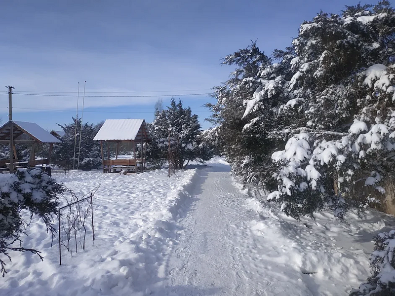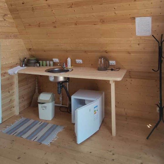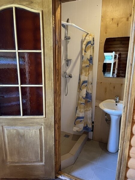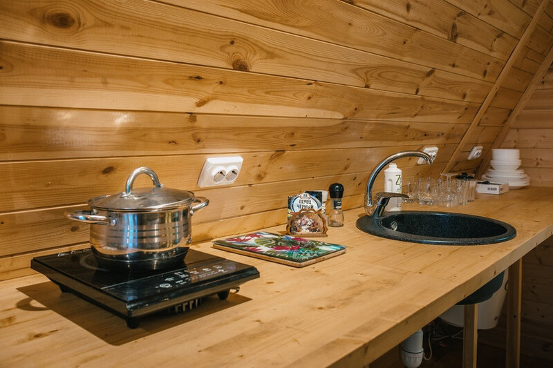 Кухня (холодильник, чайник, электро-плита, посуда). Мини-банька в доме, санузел, душ.