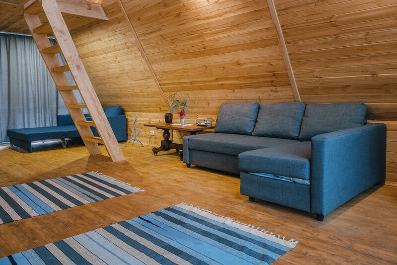6 спальных мест (1 двуспальная кровать, 2 раскладных дивана). Большой общий холл и открытый второй этаж с кроватью. Комната одна, но комфортно поделена на зоны.