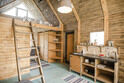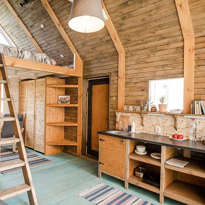 Интерьер внутри гармонично соединяет в себе спальню, гостиную и кухню. Натуральные материалы передают простоту и изысканность деревенского стиля.