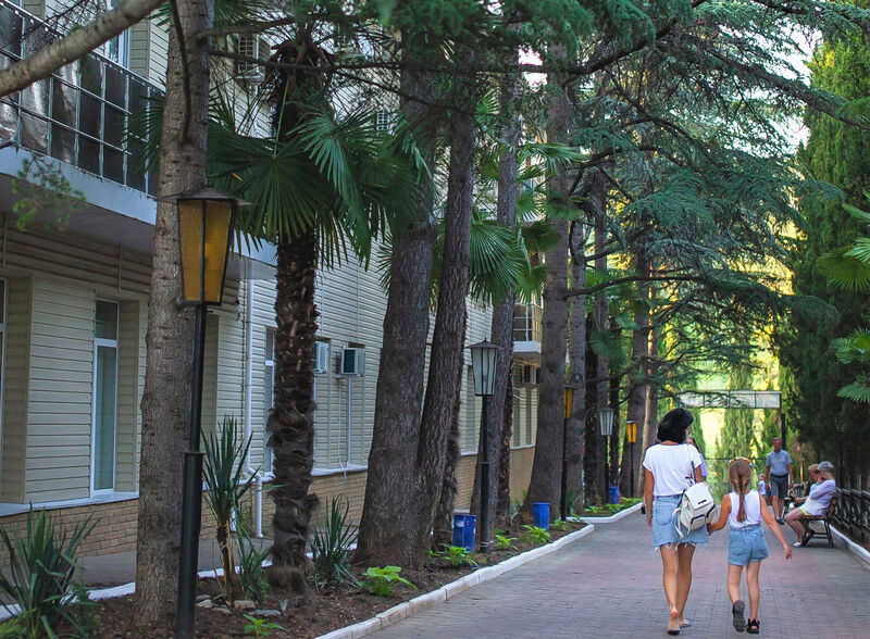 В 10 минутах ходьбы от спального корпуса распложен собственный пляж. Галечный пляж оборудован кабинками для переодевания, навесами от солнца, шезлонгами, есть пляжные развлечения на любой вкус. До побережья можно дойти пешком, а можно воспользоваться трансфером — от пансионата каждые полчаса отправляется микроавтобус.