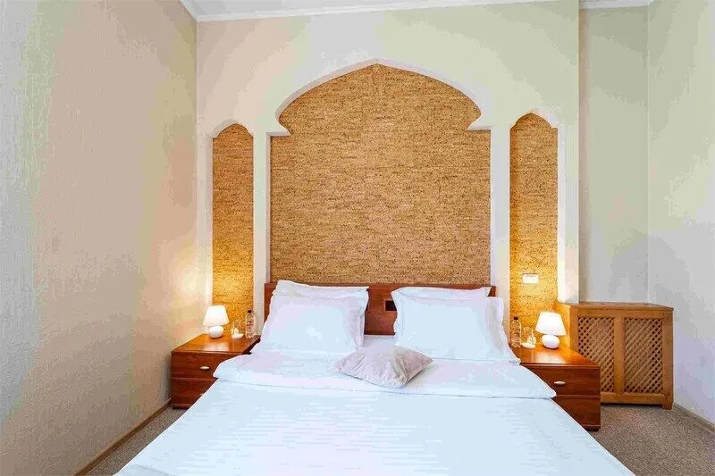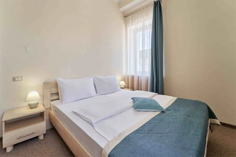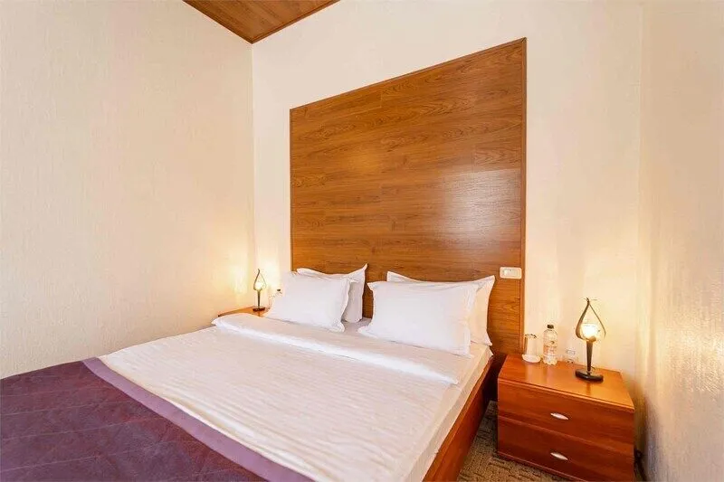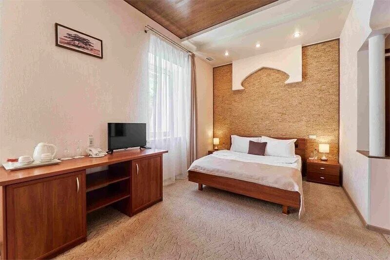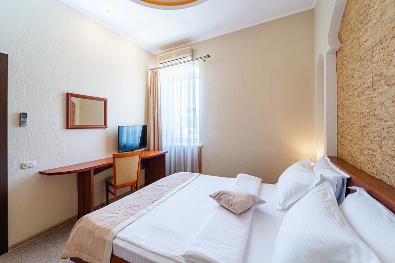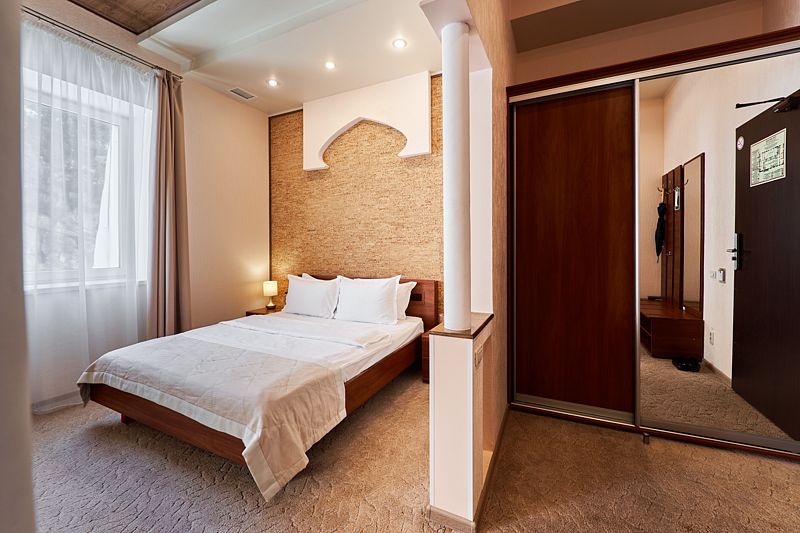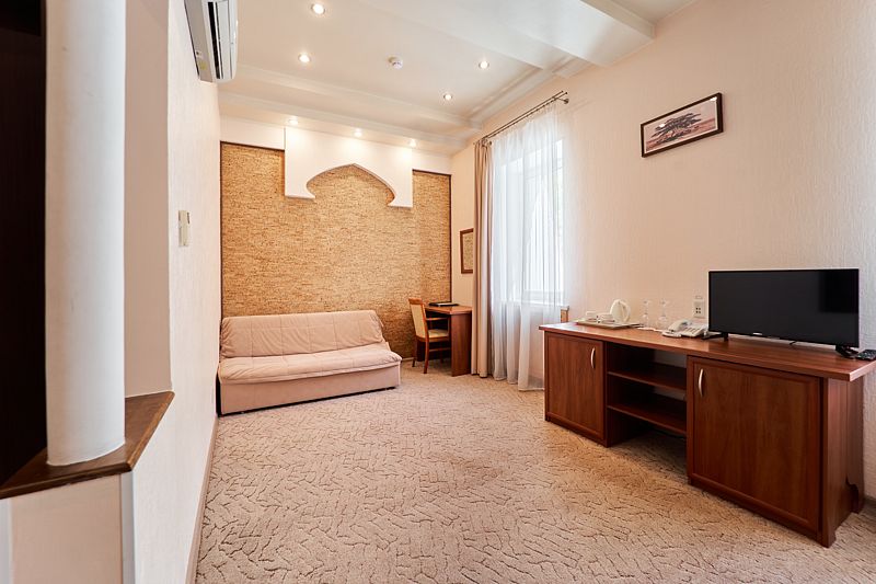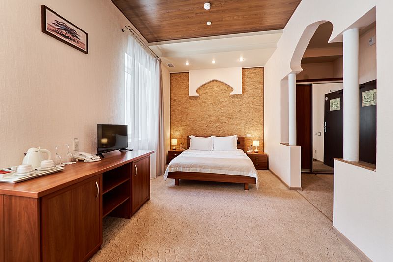 Однокомнатный номер на четвертом этаже, оформленный в восточном стиле, в приятных теплых тонах. В номере -двуспальная кровать и раскладной комфортный диван-книжка, стол консоль, шкаф купе с зеркальным покрытием, прикроватные тумбочки, чайник, мини холодильник, плазменный телевизор. Ванная комната выполнена мозаикой, ванная, душ, биде, халаты и тапочки, а также фен и косметические принадлежности.