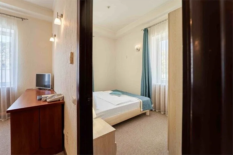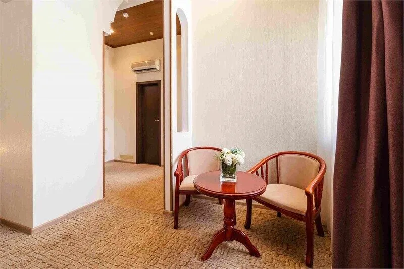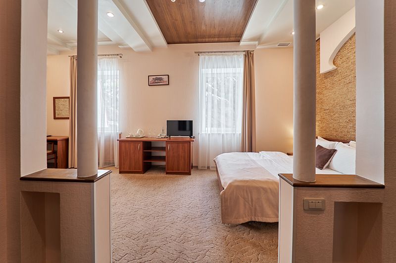 Двухкомнатный просторный номер располагает в гостиной диваном-книжкой, письменным столом, мини холодильником и прихожей, в спальне расположенная двуспальная кровать, шкаф купе, прикроватные тумбы, телевизор. Ванная комната — душ и ванная, косметические принадлежности, халаты и тапочки, фен.