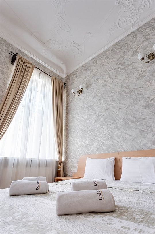 Просторный комфортабельный номер категории «Люкс» с высоким потолком, сохранённый с оригинальными узорами и орнаментами начала ХХ Века категории с потрясающим видом на Историческое здание начала ХХ Века.Услуги и удобства