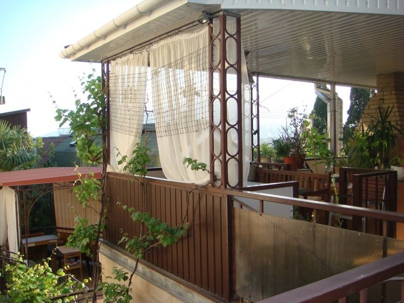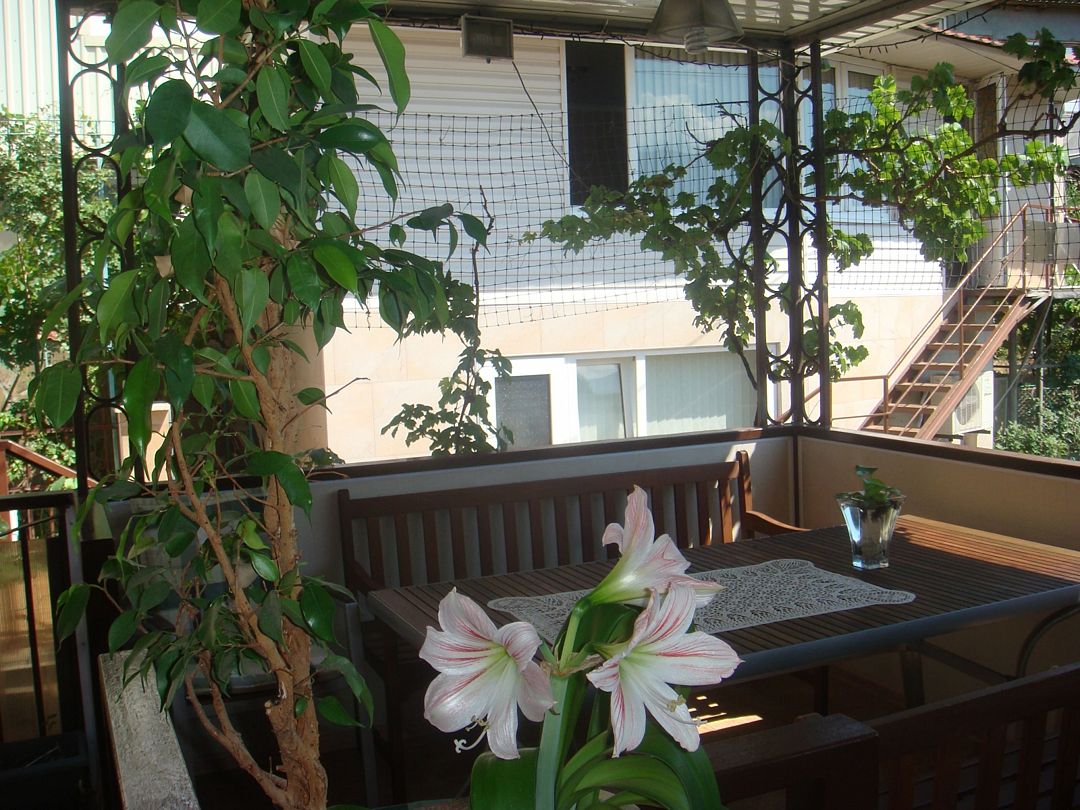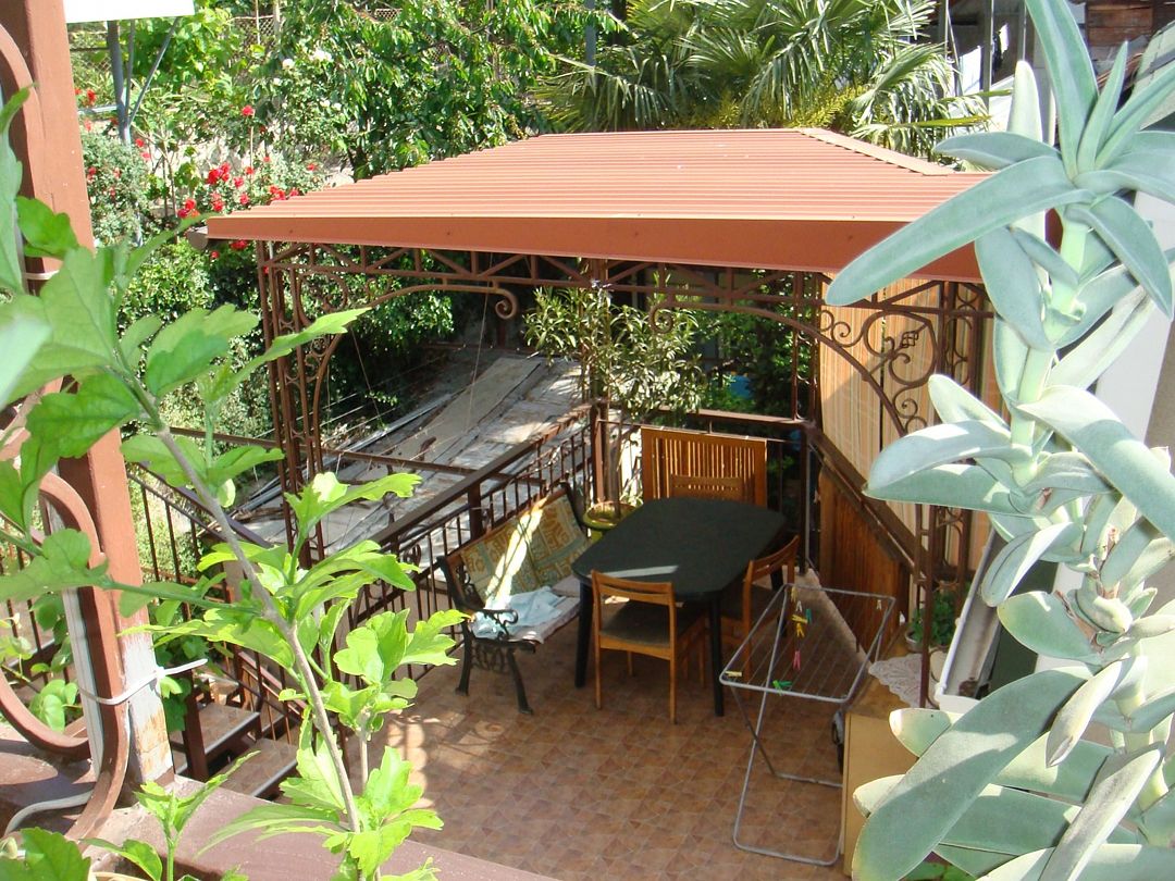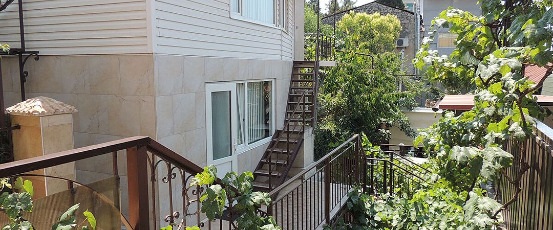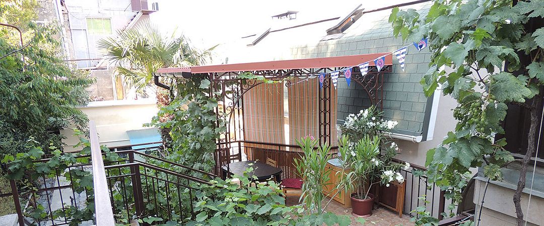 Домик второй этаж на троих с двухспальной и односпальной кроватями . Комната с раздельным санузлом ,холодильником, электрочайником и кондиционером. Кухня оборудована посудой и техникой, расположена в отдельном помещении рядом с домиком. В закрытом уютном дворике расположены беседки и барбекю. Массандровский пляж в 2-х минутах прогулочного шага. Большая видовая терраса с видом на море и горы.Двухместный Deluxe
