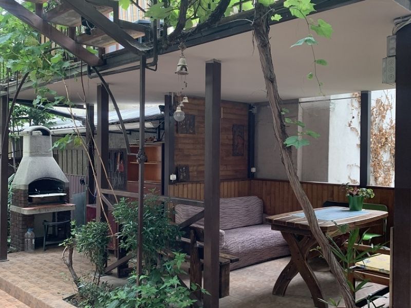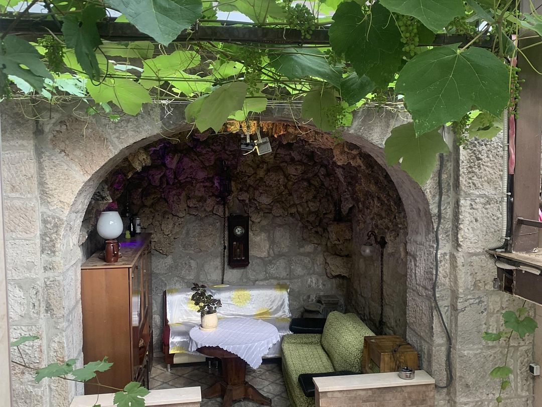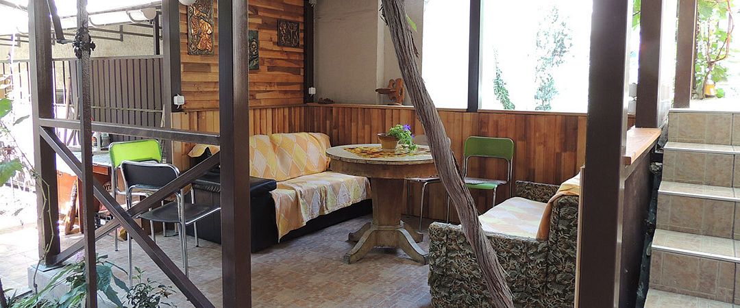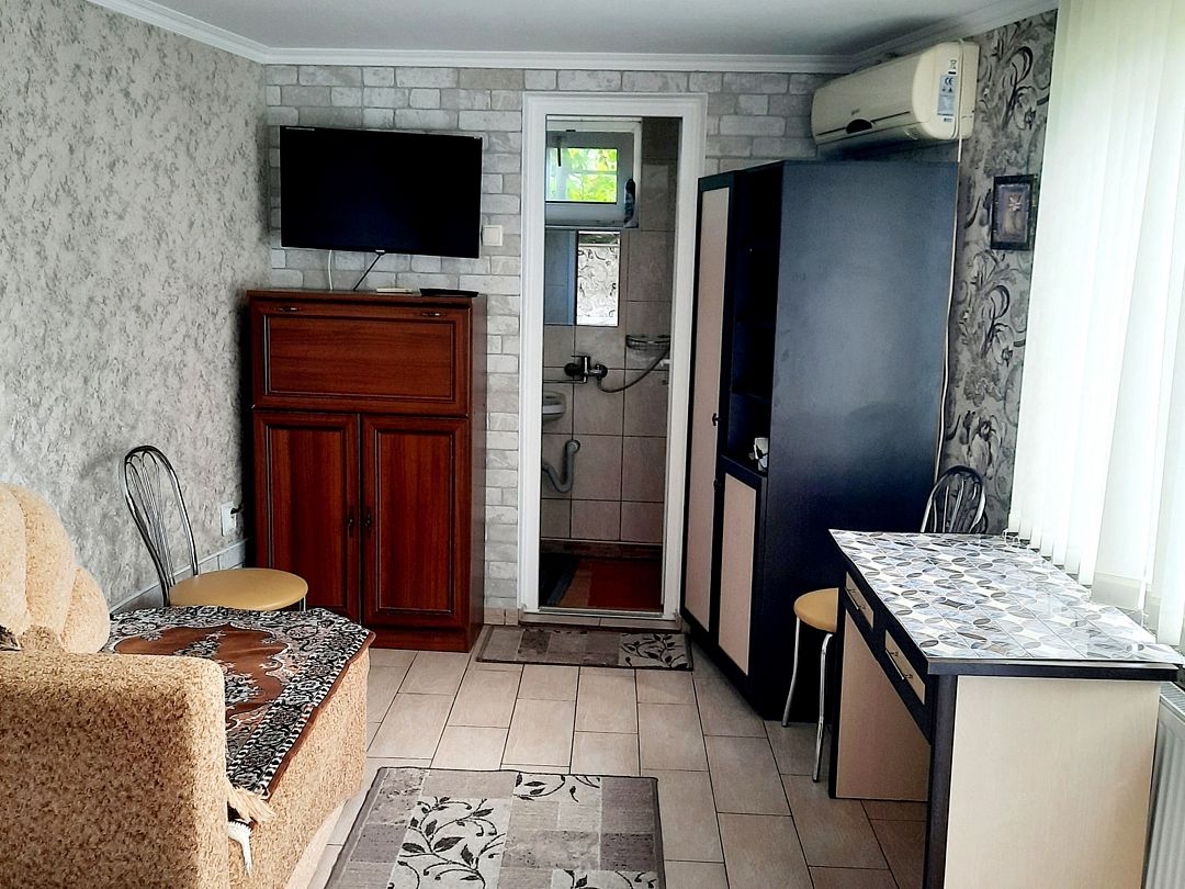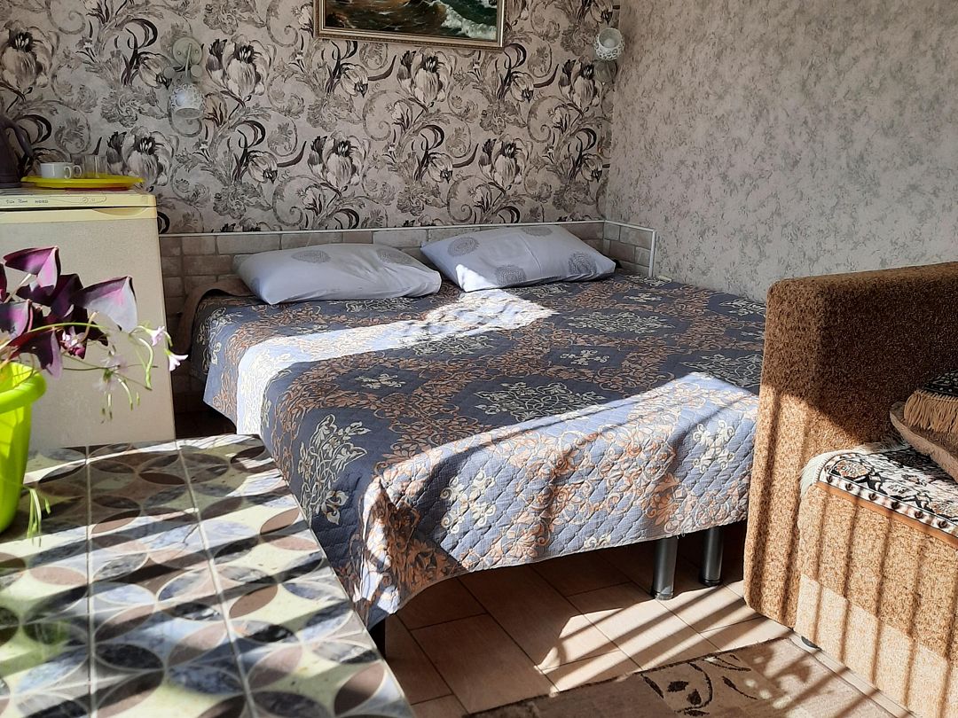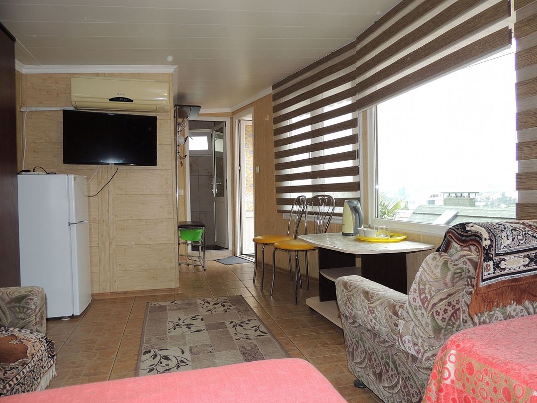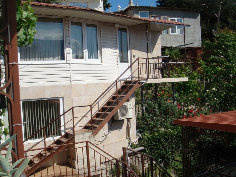 Домик первый этаж на двоих с двухспальной кроватей и диванчиком ( дополнительное место ) . В комнате свой санузлом ,холодильник, электрочайник и кондиционером с телевизором . Кухня оборудована посудой и техникой, расположена в отдельном помещении ,рядом с домиком. В закрытом уютном дворике расположены беседки и барбекю. Большая видовая терраса с видом на море и горы.Массандровский пляж в 2-х минутах прогулочного шага.Домик 2 этаж