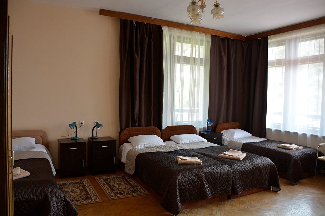 Площадь номера – 18кв.м. В каждом номере: необходимая мебель, холодильник, телевизор и кондиционер. Номера находятся в блоке. На два номера общий коридор в котором расположены два санузла. Номера однокомнатные, расположены на 1,2,3 этажах. Балкон с видом на горы. В номере два основных и два дополнительных места.Услуги и удобства