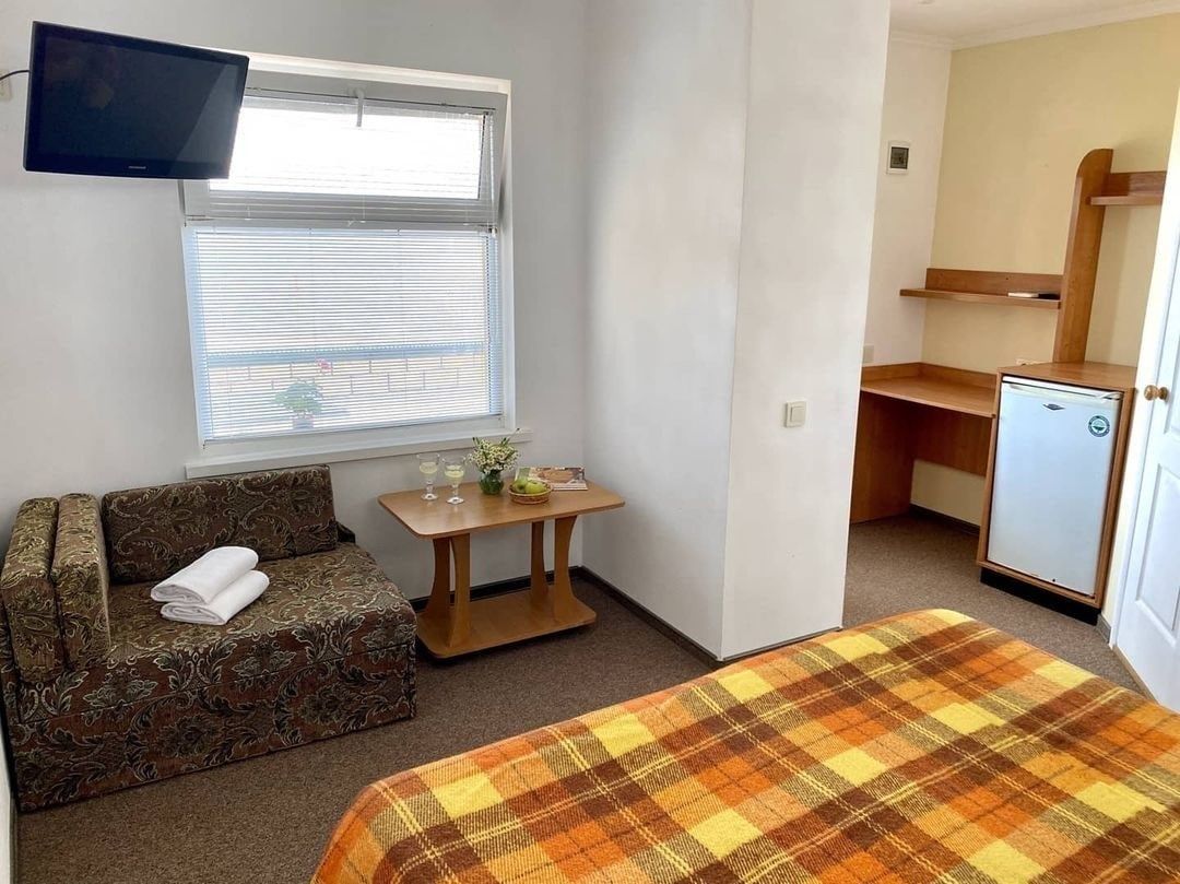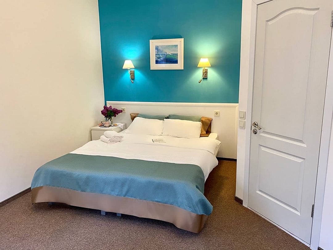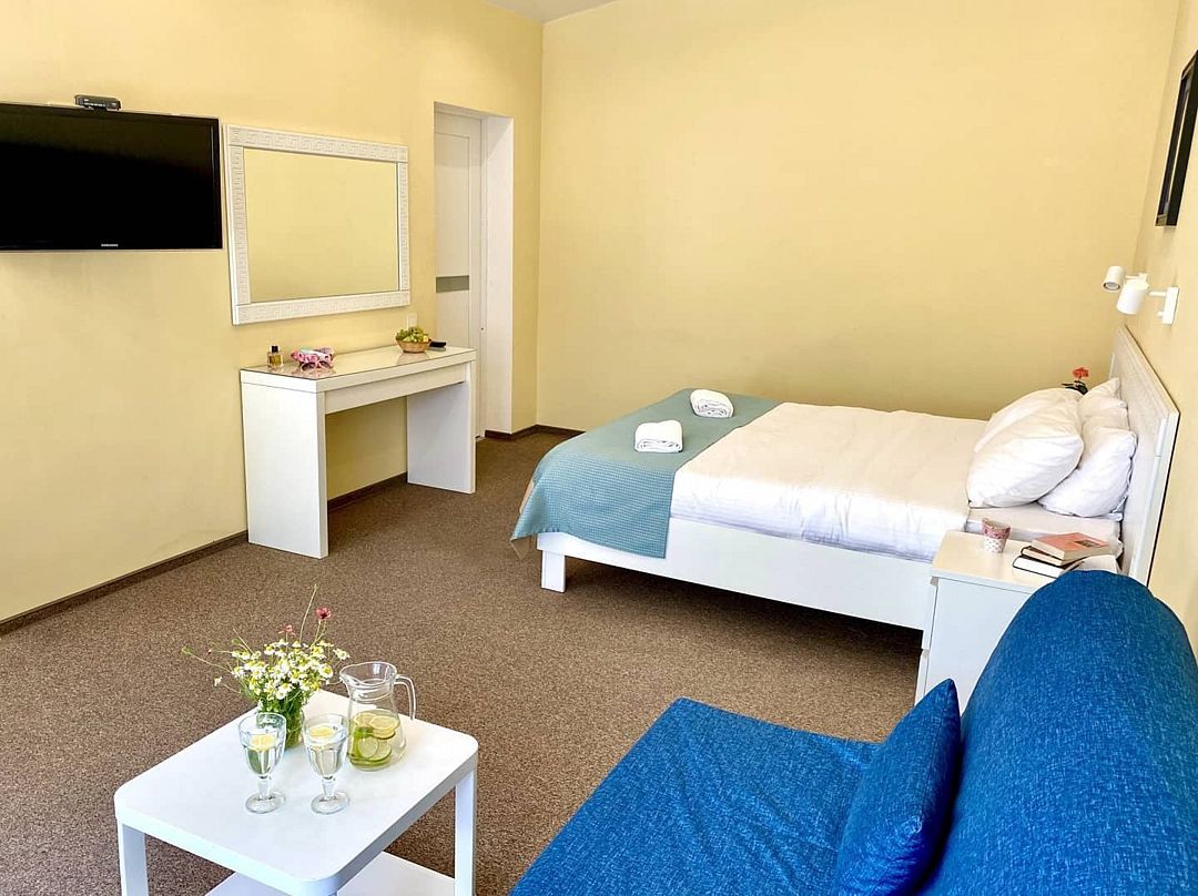 Улучшенный номер с балконом для проживания 2-3 гостей. Номер расположен на втором этаже двухэтажного корпуса. В зависимости от расположения номера, с балкона открывается отличный вид на Керченский пролив. Идеально подойдет парам или для особых событий: например, как номер для молодоженов или для романтического уикенда. Дизайн номера выполнен в морских тонах, внутри вы найдете все необходимое для комфортного пребывания. Стоит отметить, что корпус расположен в 10 метрах от кромки моря, поэтому если вы чувствительны к звукам морского прибоя во время сна, рекомендуем бронировать номера в противоположной части корпуса.Услуги и удобства